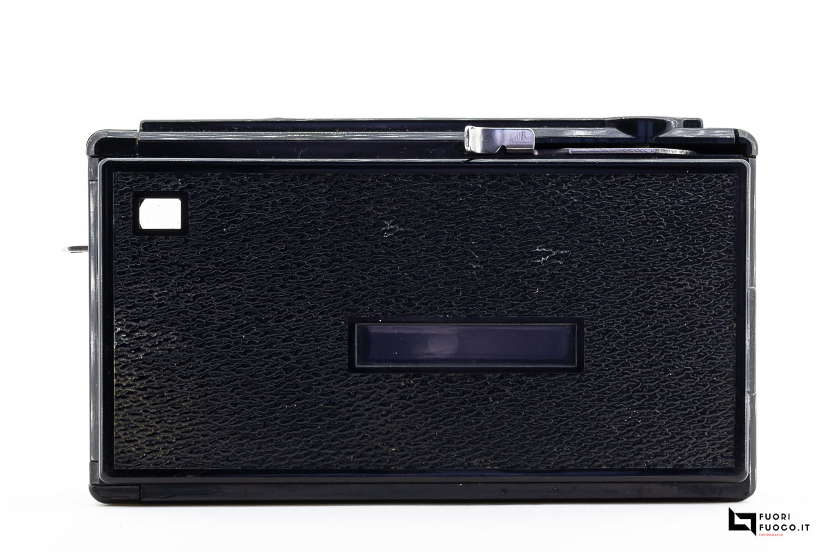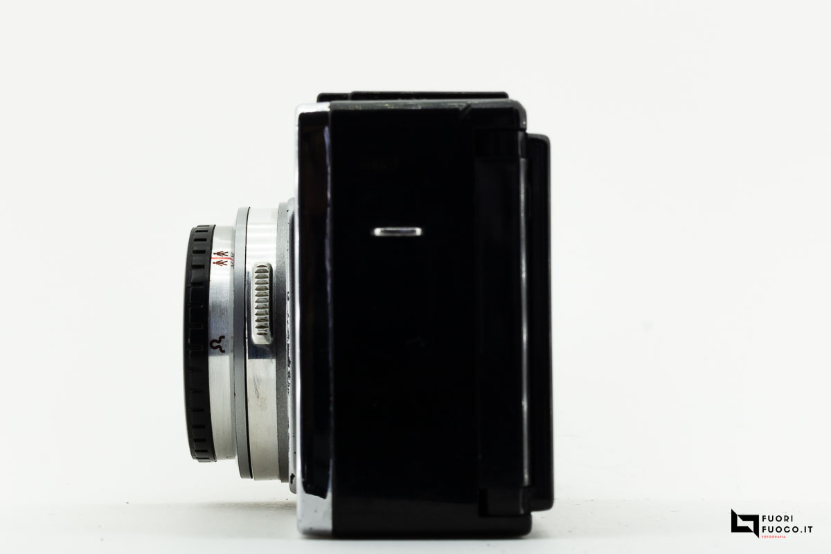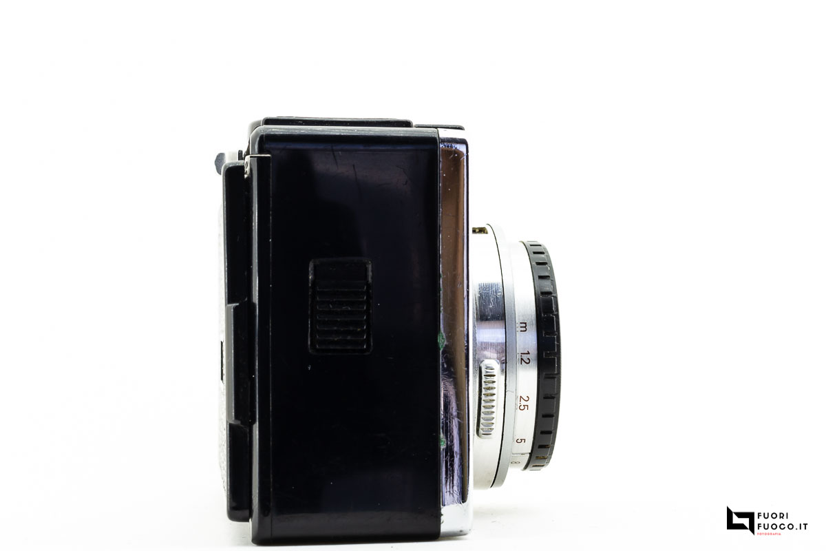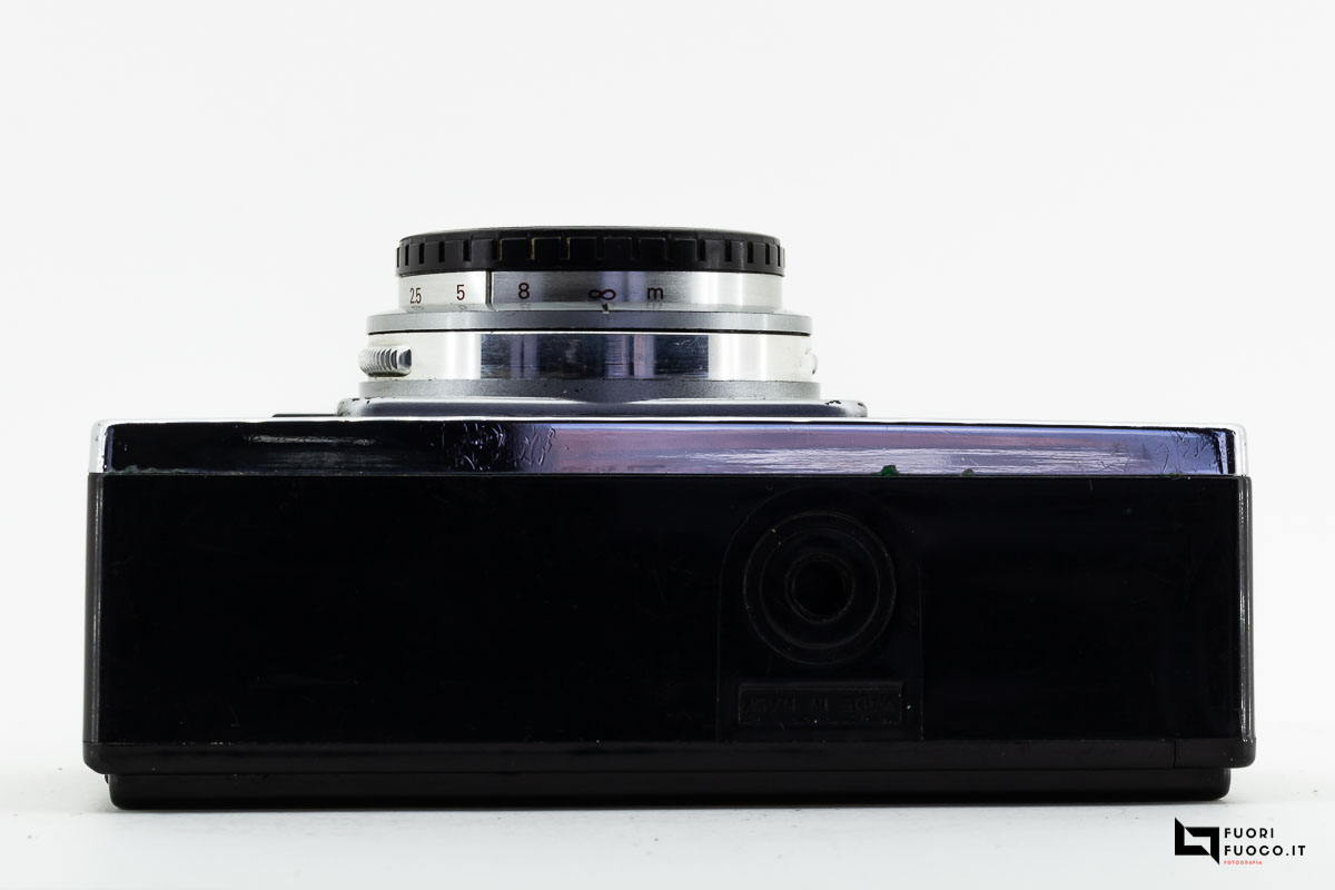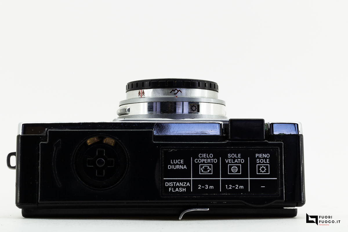 Sul coperchio si nota l’attacco per il flash, il pulsante di scatto e la tabella indicativa sulle distanze e i diaframmi.