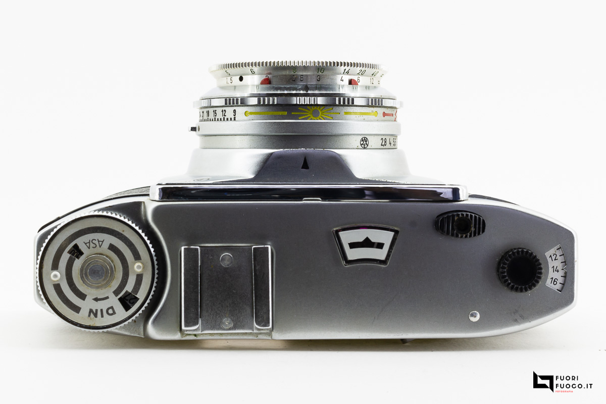 A sinistra la rotella per il riavvolgimento della pellicola.