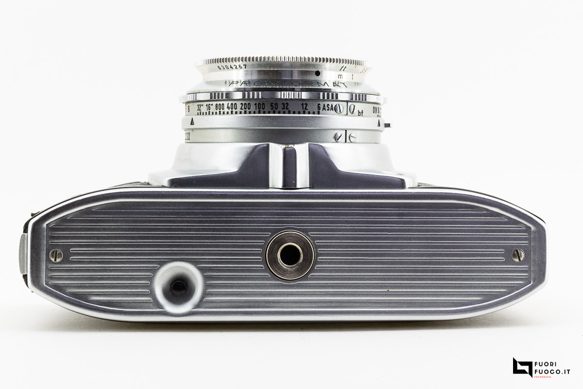 Sul fondello troviamo la vite filettata per l’utilizzo del treppiede e il pulsante di sgancio della pellicola.