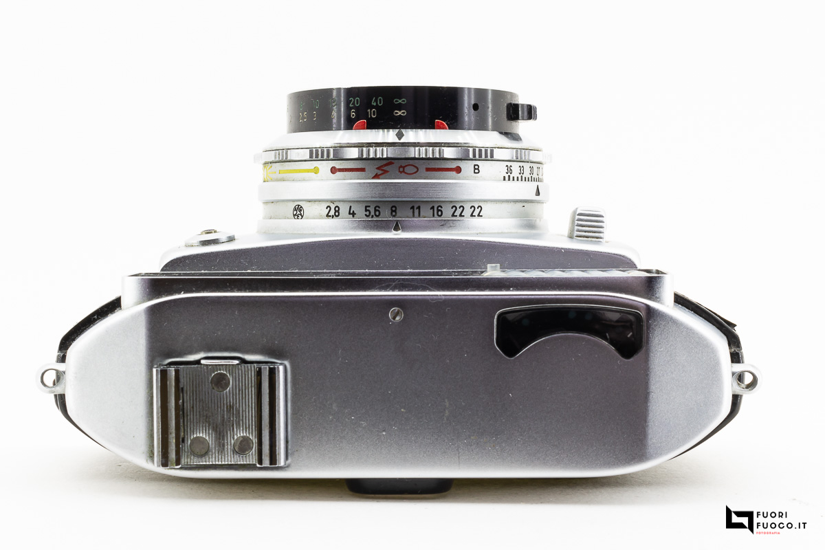 l’obiettivo montato sulla fotocamera è  un obiettivo è un Color-Baldanar 2.8/45 a 3 elementi. La lunghezza focale è di 45mm.