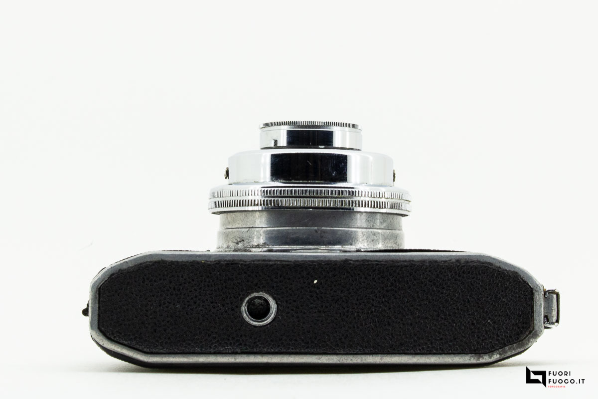 Sulla parte destra è presente la staffa per l’attacco del lampeggiatore e la grande ruota per l’avanzamento della pellicola.