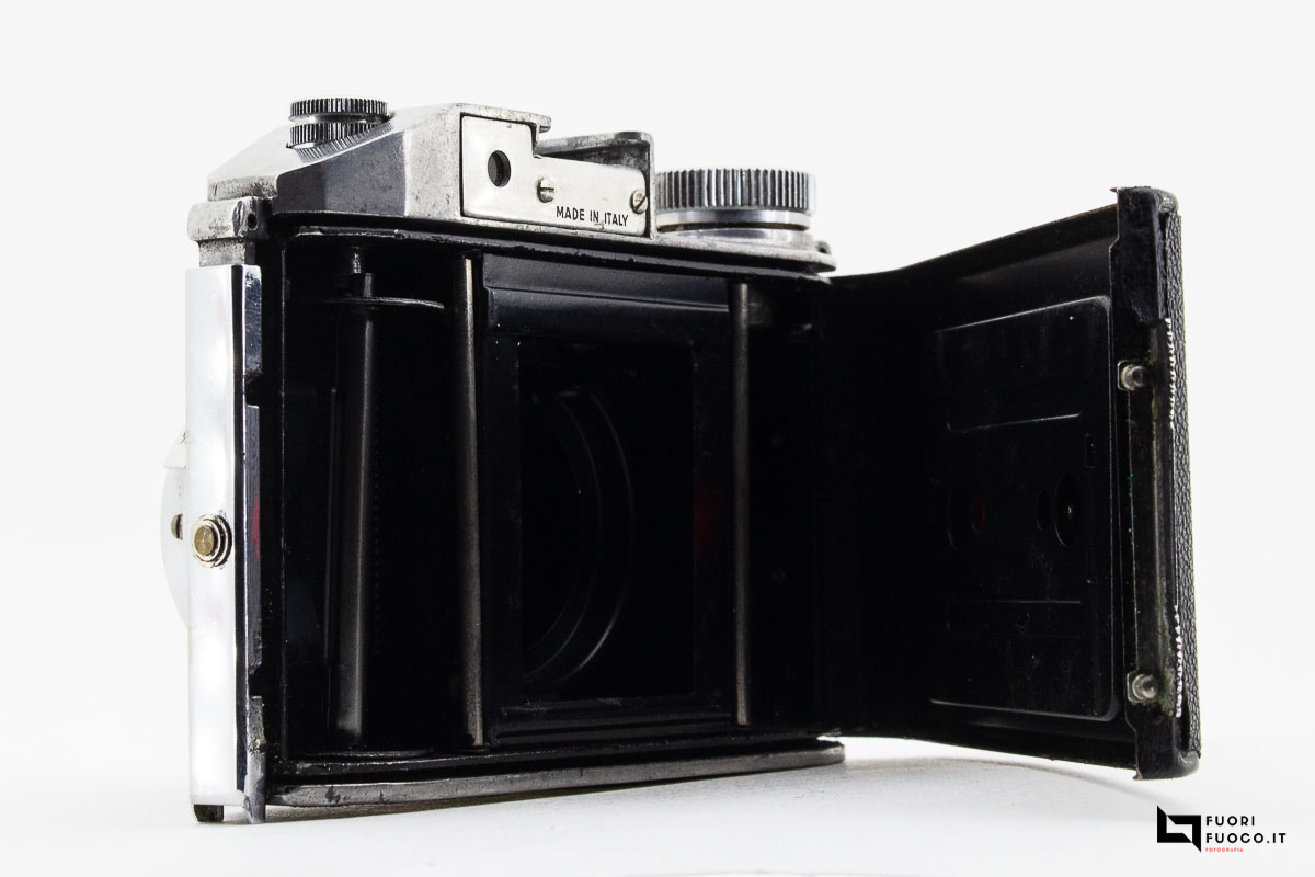 Sulla parte posteriore sono presenti due finestrelle rosse di forma tondeggiante per verificare la numerazione durante l’avanzamento della pellicola.