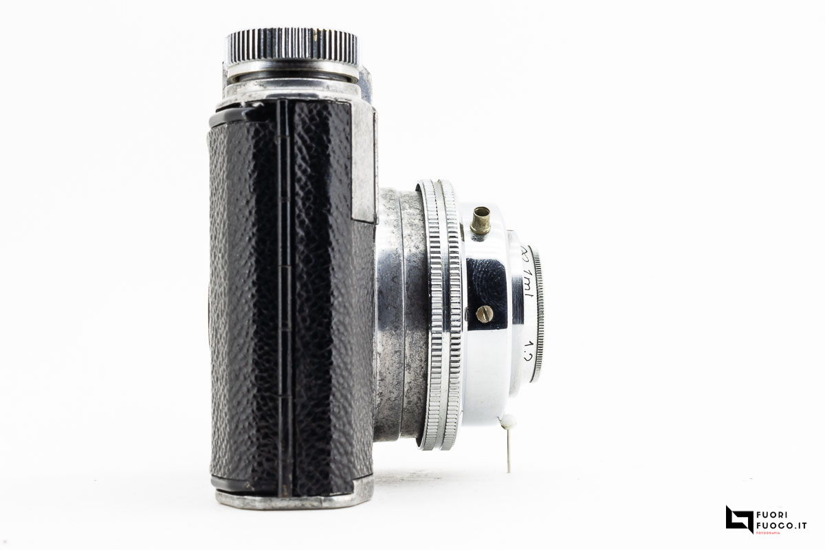 Sulla parte destra è presente la staffa per l’attacco del lampeggiatore e la grande ruota per l’avanzamento della pellicola.