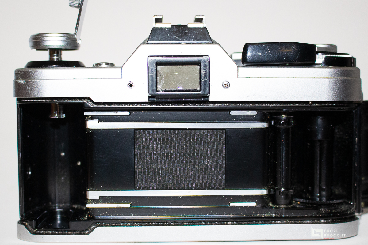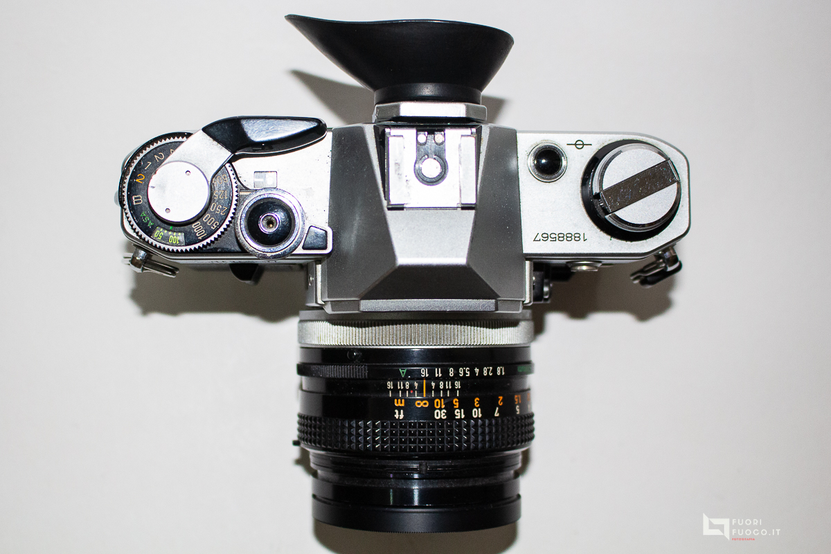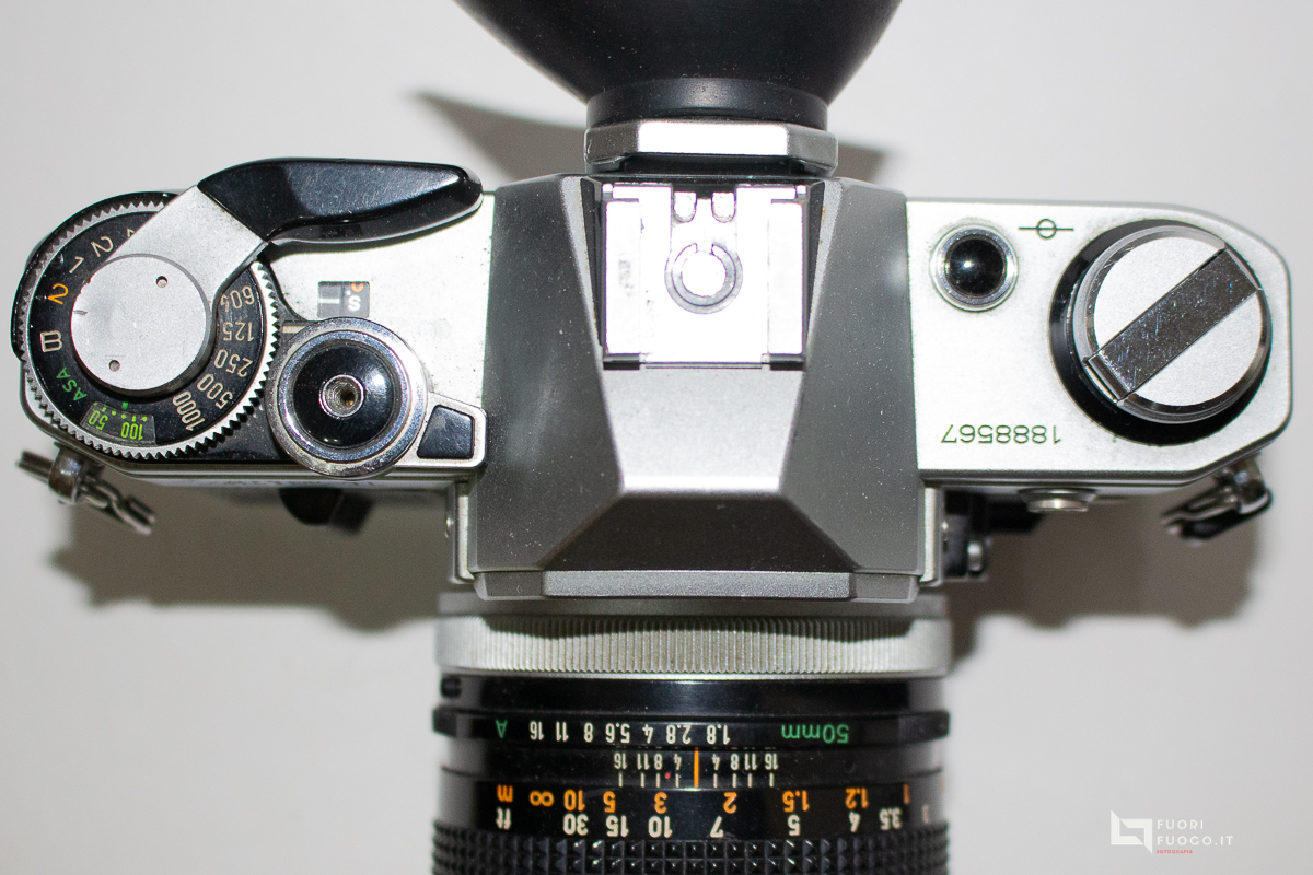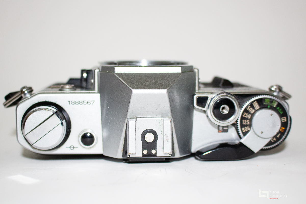 - Esposimetro: CdS pesato al centro con esposizione automatica a priorità di otturatore, misurazione TTL a piena apertura