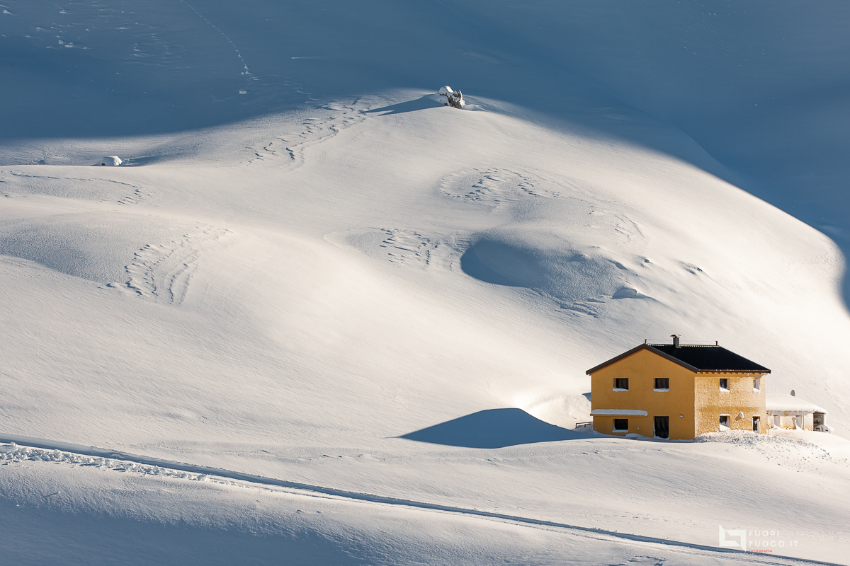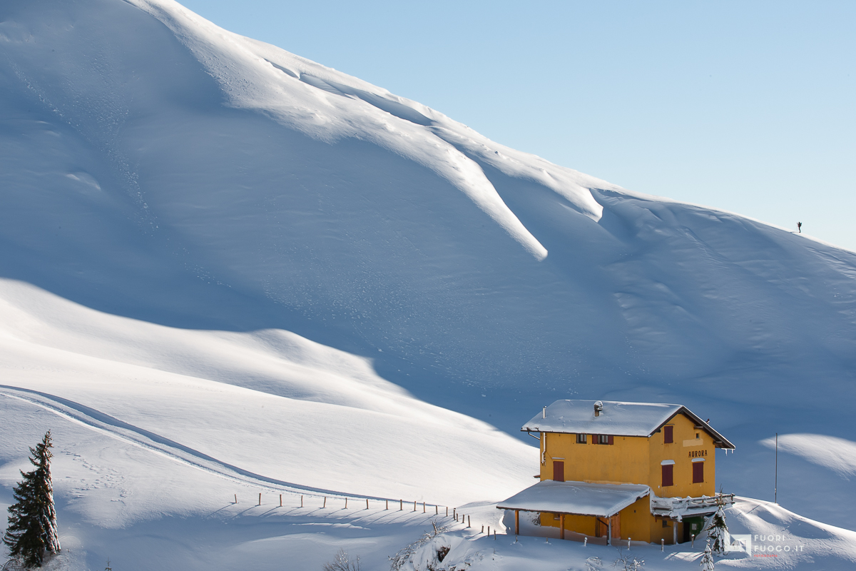 Mi dirigo verso il rifugio Castelli, la cima di Piazzo è ben visibile… poi verso il Cazzaniga Merlini, tagliando per valloncelle dalla neve perfettamente liscia e regolare, Le ciaspole fanno il loro lavoro, impossibile oggi farne a meno, la neve si attesta sui 120 cm…