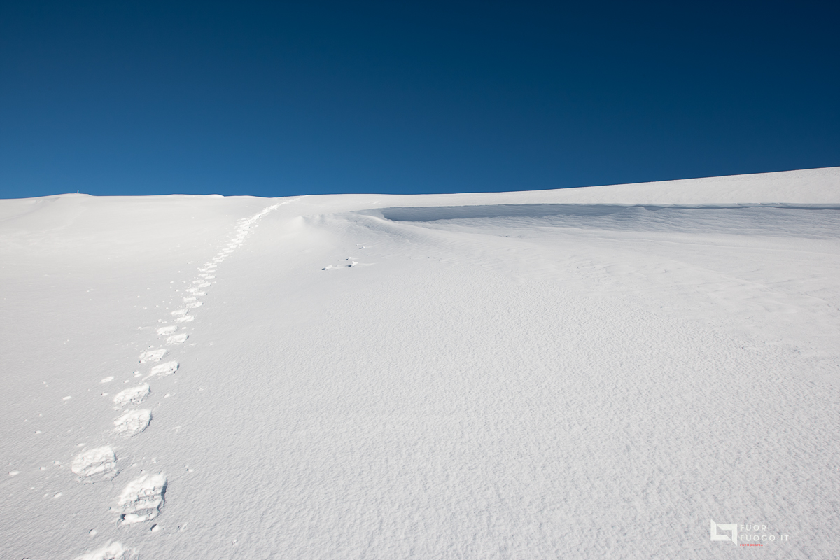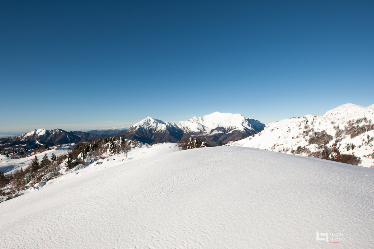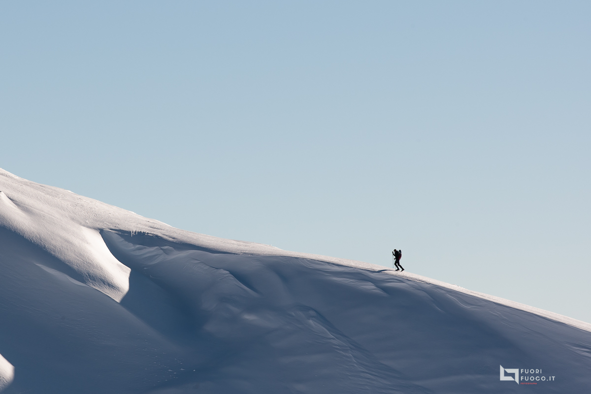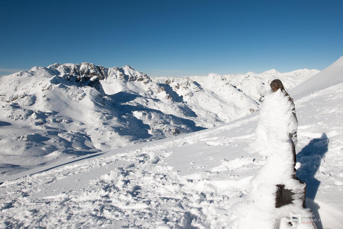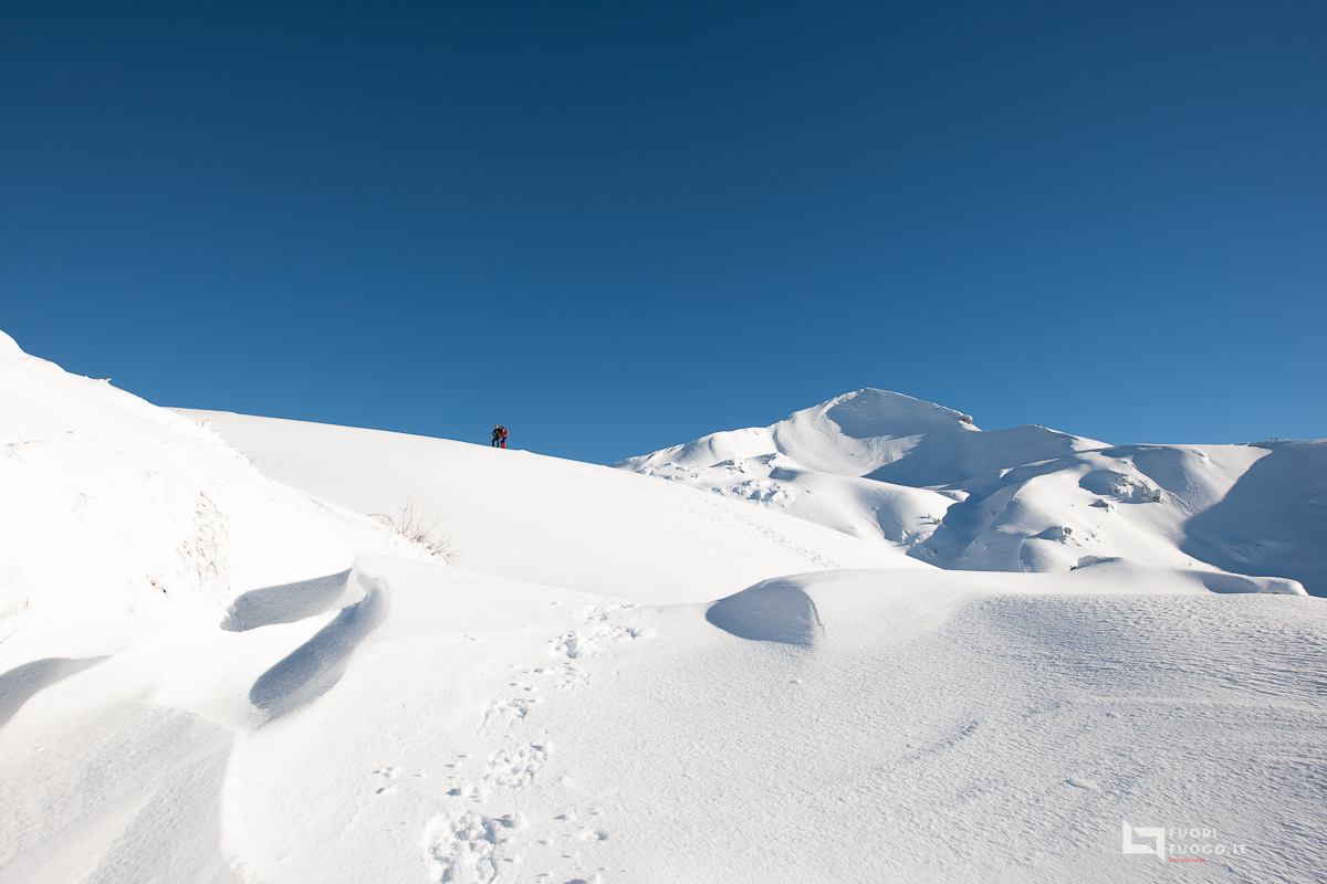 Oltrepassato il Rifugio Nicola, la Cima di Piazzo si vede in tutta la sua bellezza, una fila di ciaspolatori e scialpinisti mi precede sulla via ancora non troppo battuta, la visione è spettacolare una volta in cima…..