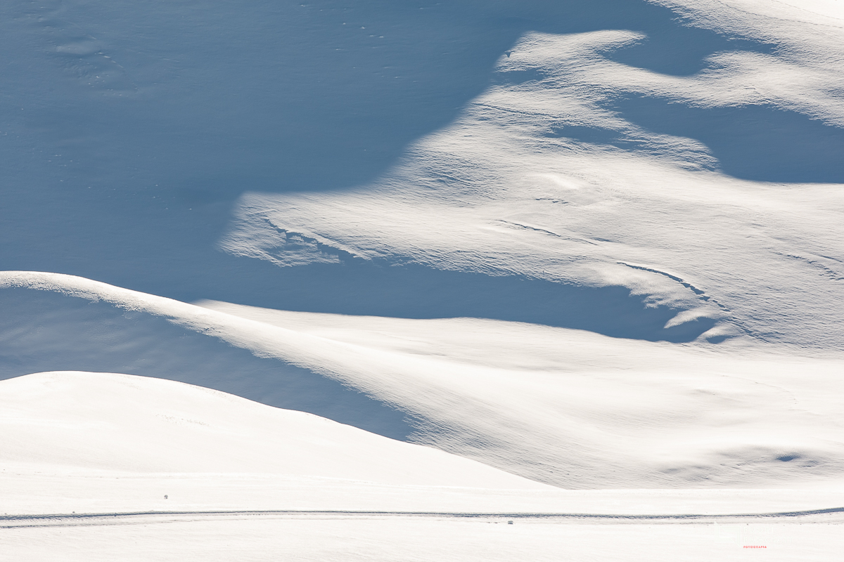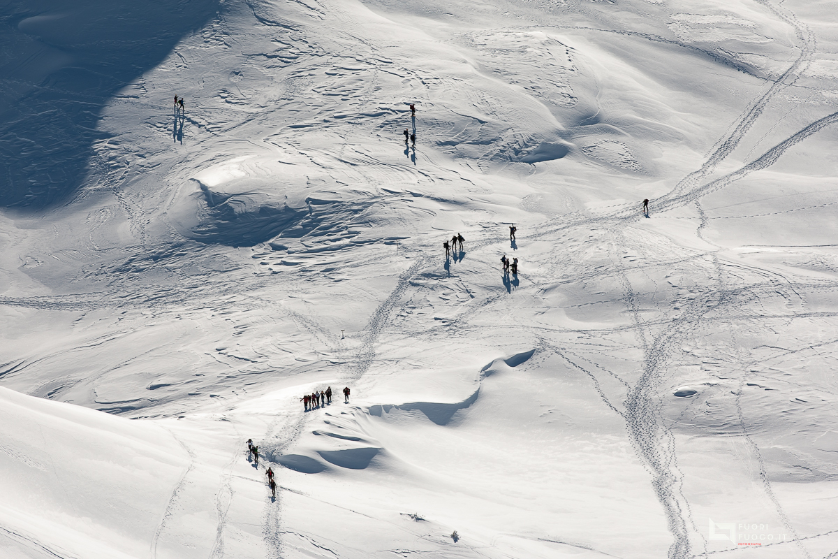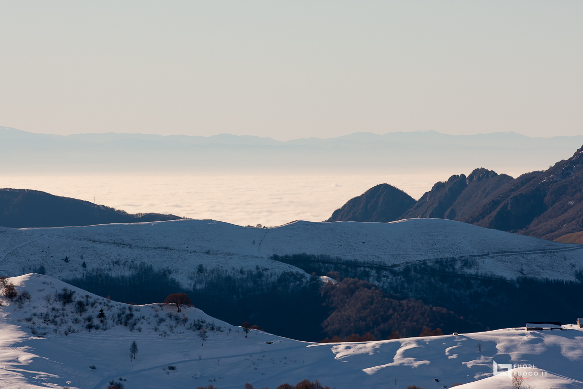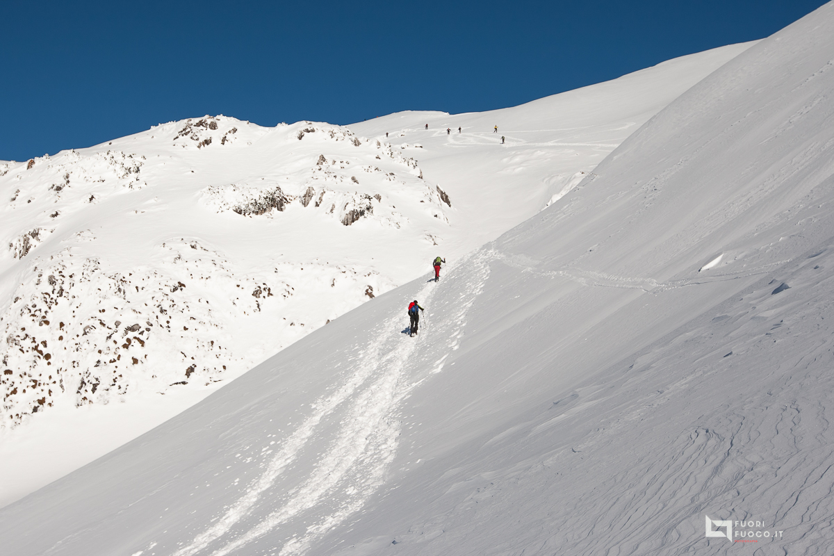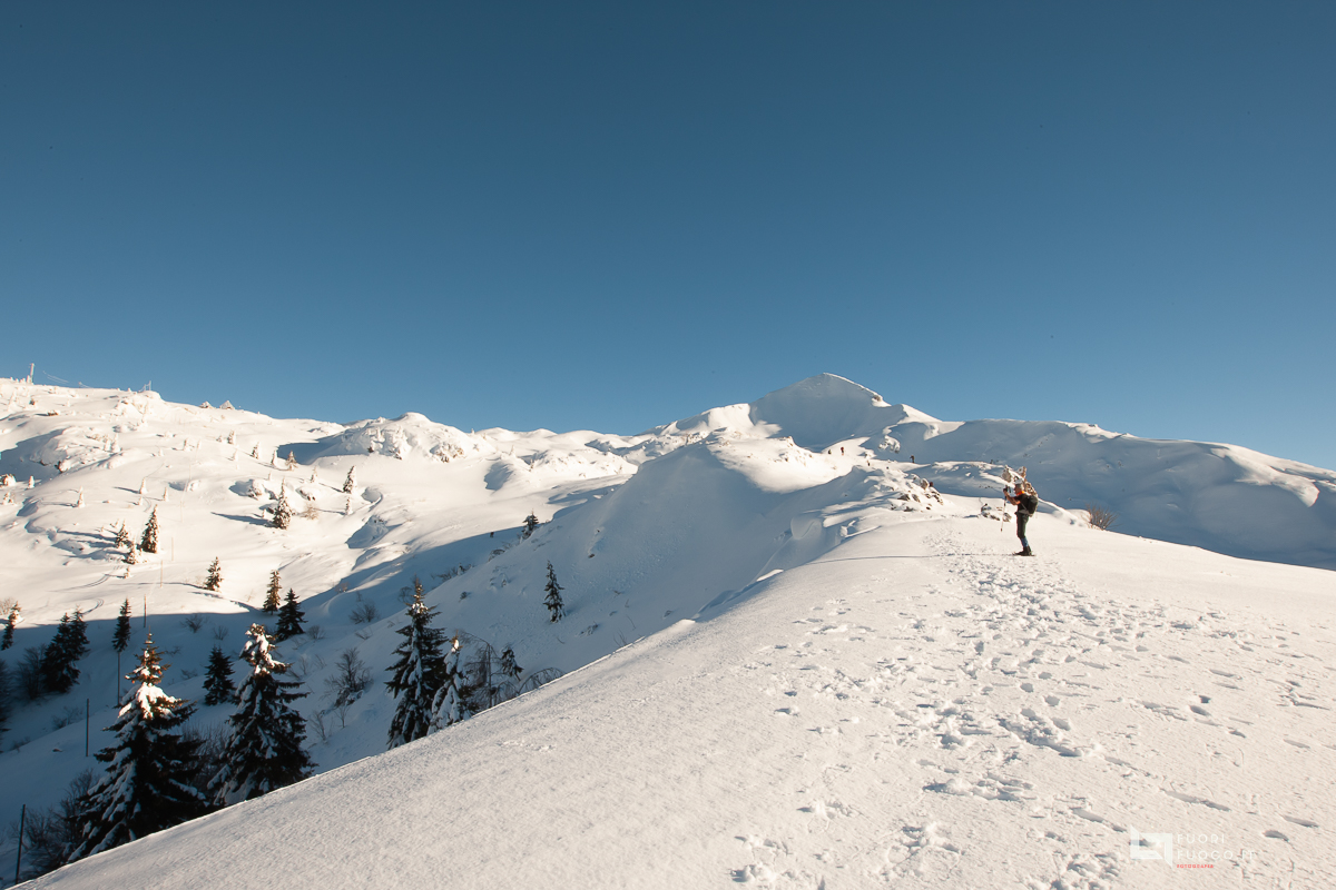 Oltrepassato il Rifugio Nicola, la Cima di Piazzo si vede in tutta la sua bellezza, una fila di ciaspolatori e scialpinisti mi precede sulla via ancora non troppo battuta, la visione è spettacolare una volta in cima…..