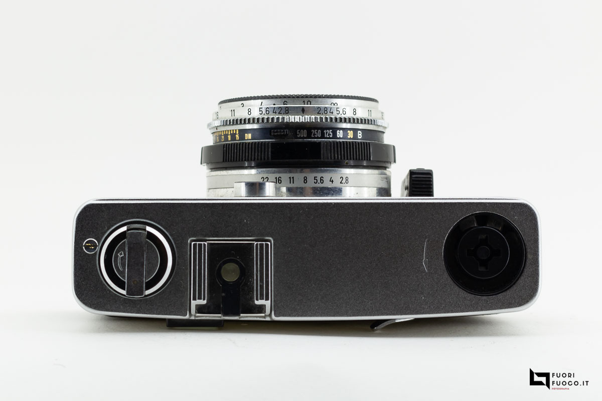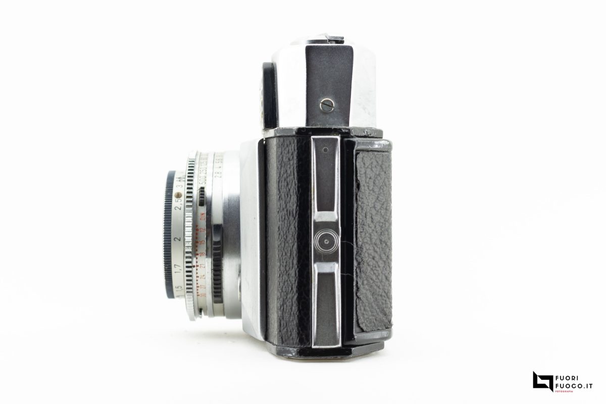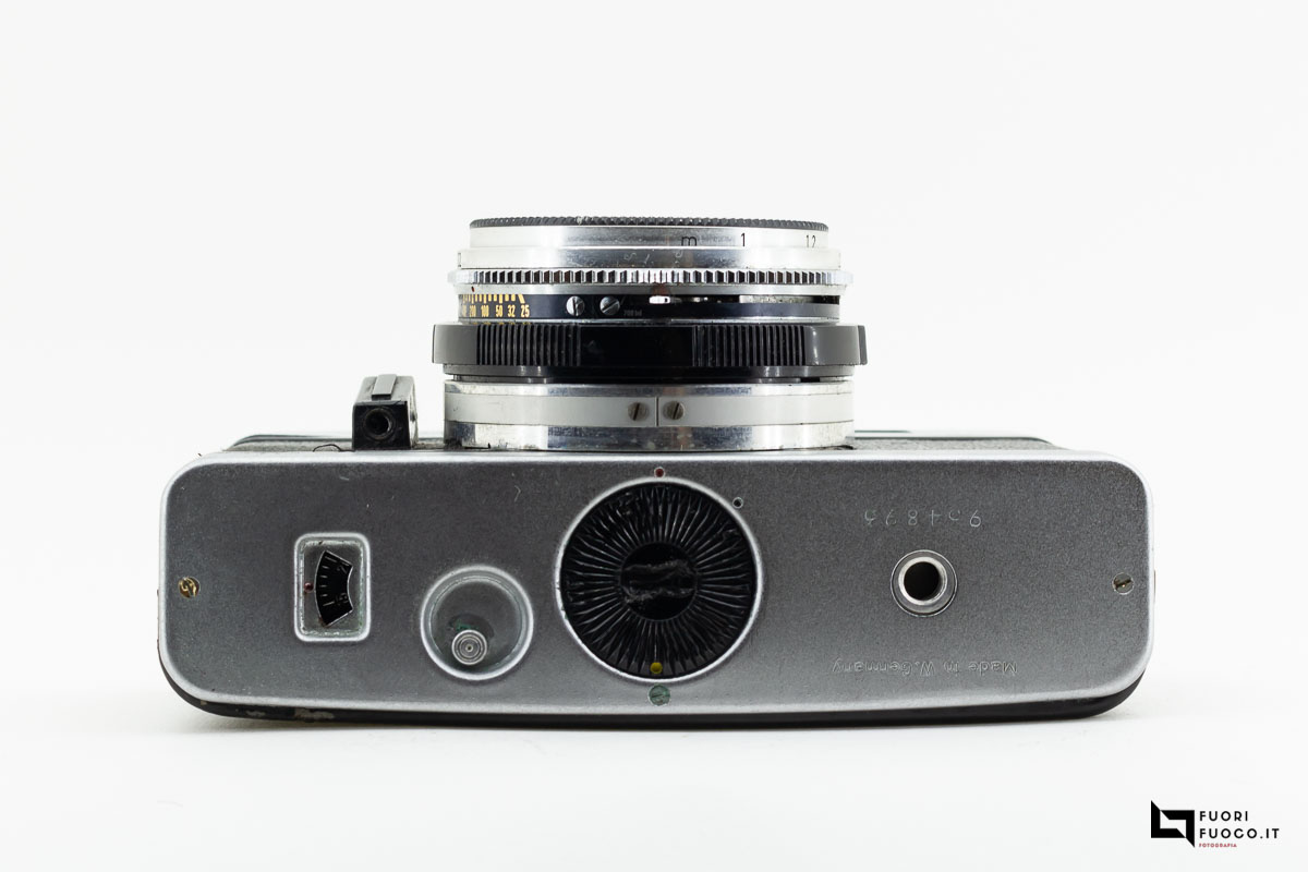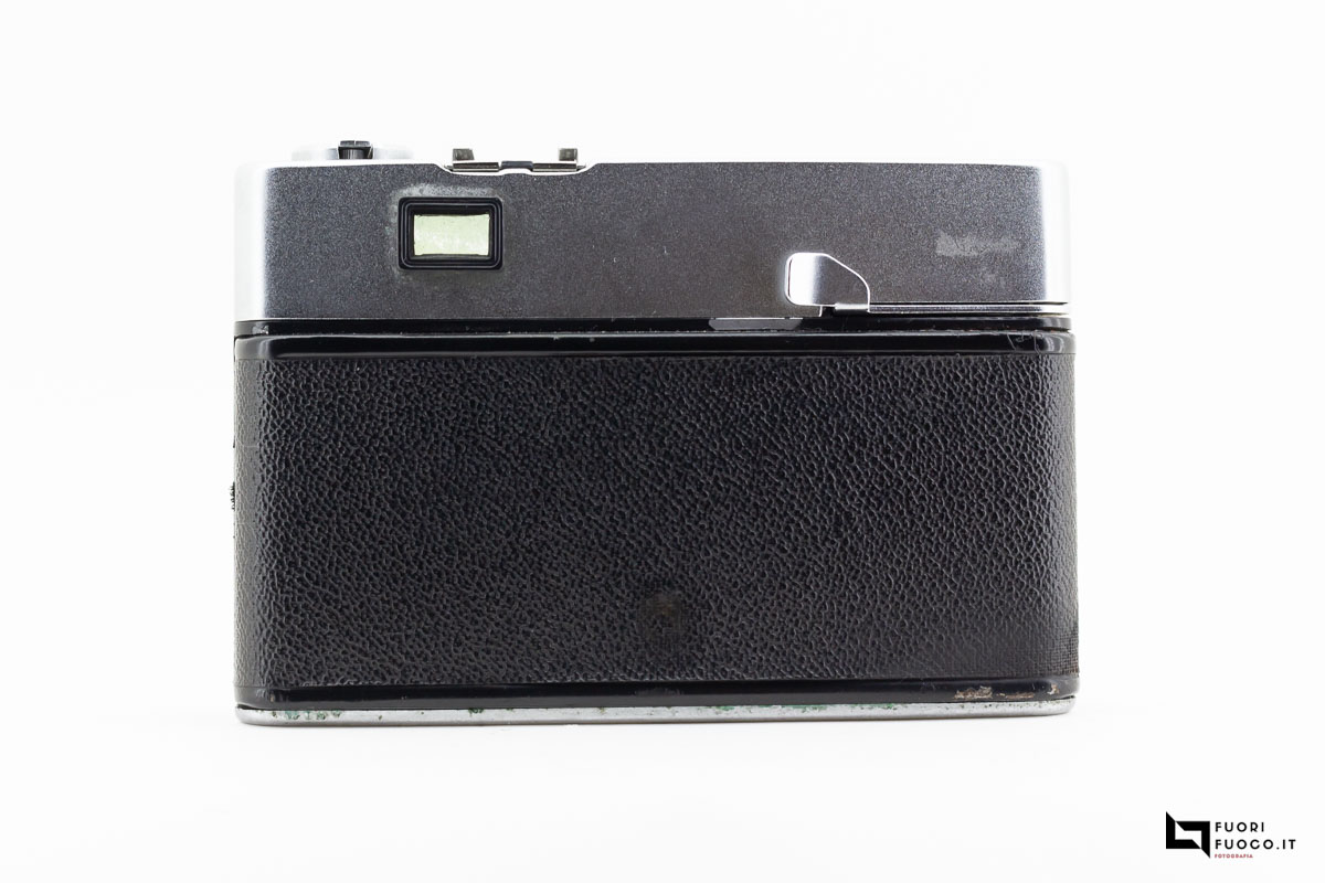 Sul retro sono presenti la manovella per l’avanzamento della pellicola e il mirino, abbastanza luminoso con all’interno la  grafica a croce per una corretta composizione.