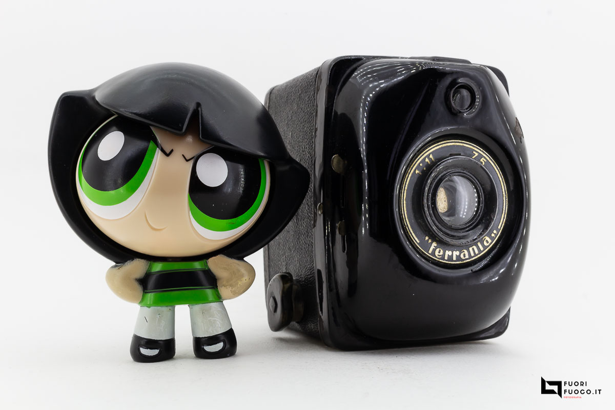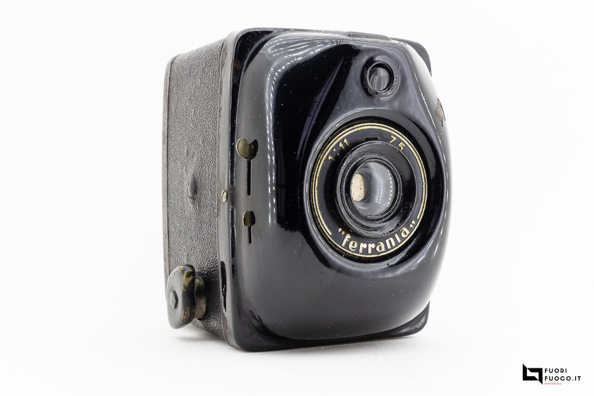 La box Ferrania, monta un obiettivo fisso con apertura a f11, visibile sul frontale, sempre sul frontale la presa di luce del mirino, posto sulla parte superiore.