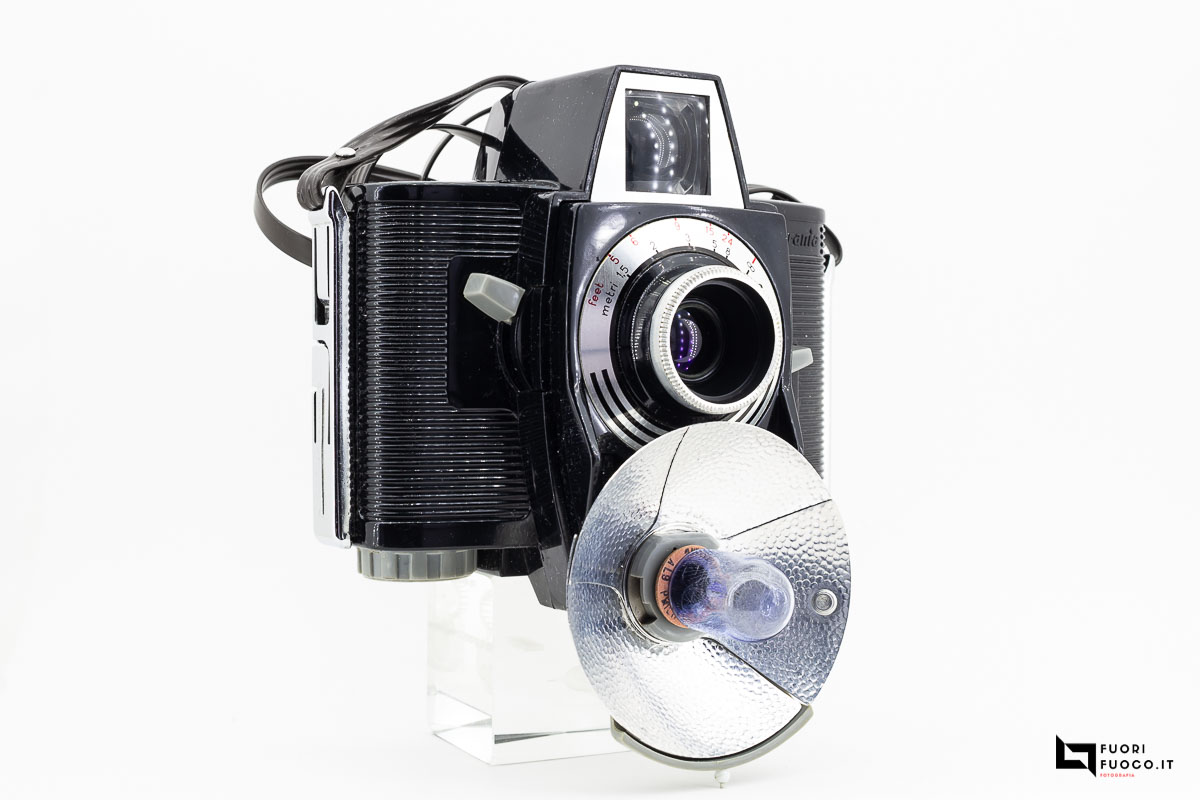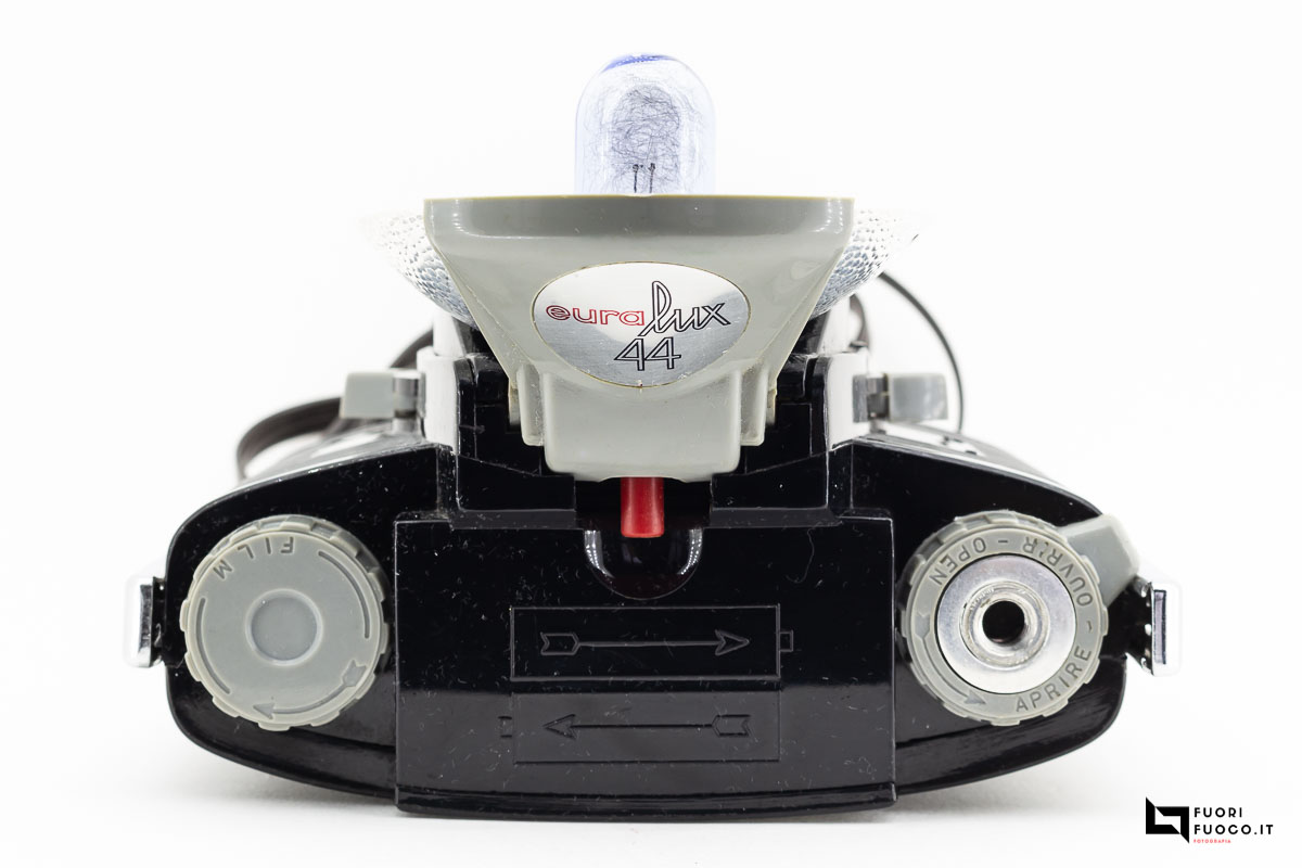 Per utilizzare il flash incorporato è necessario abbassare il relativo coperchiò aprire le alette cromate a ventaglio, mentre per espellere la lampadina bisogna pigiare il bottonaio rosso.