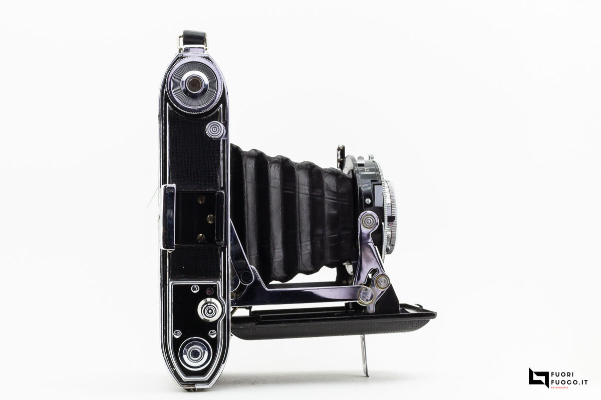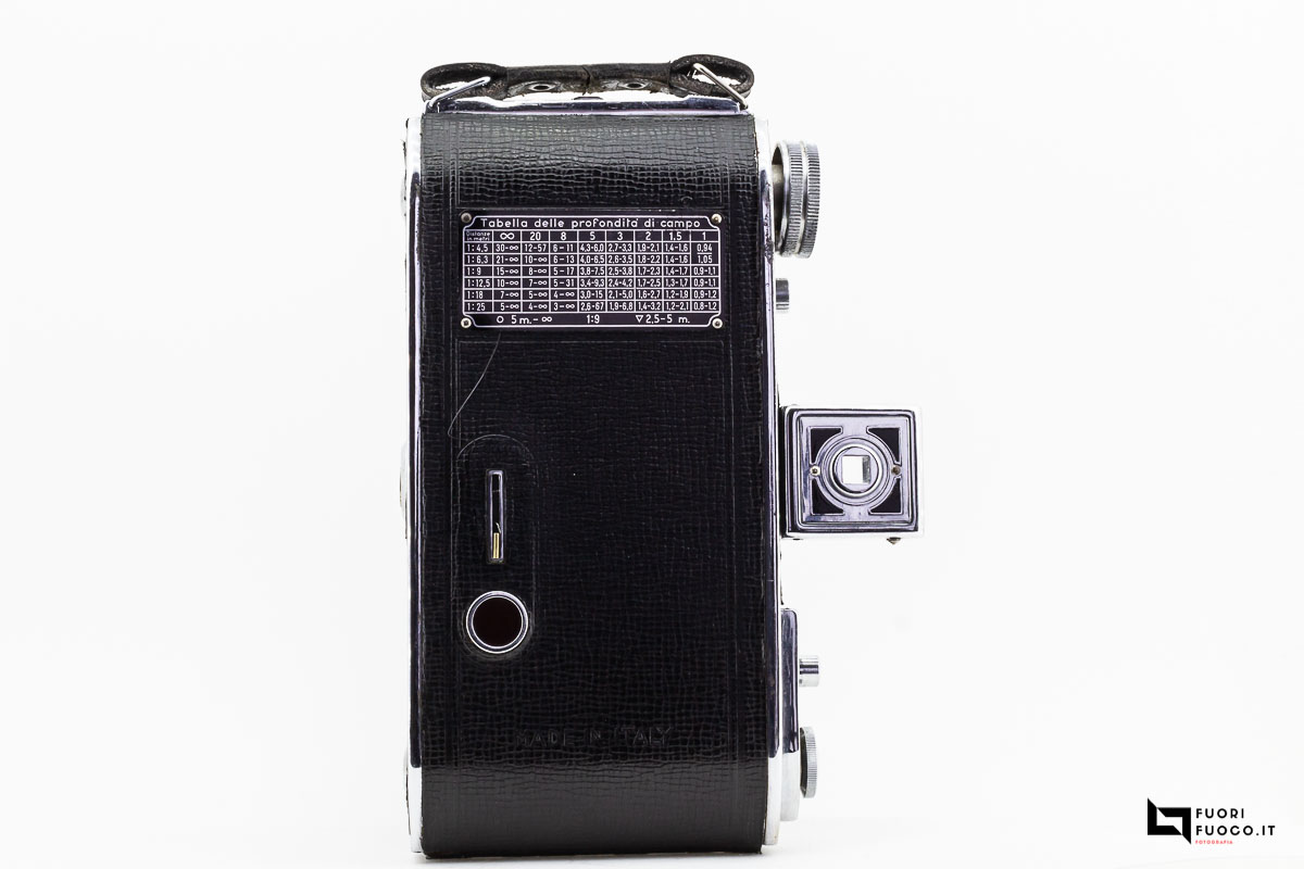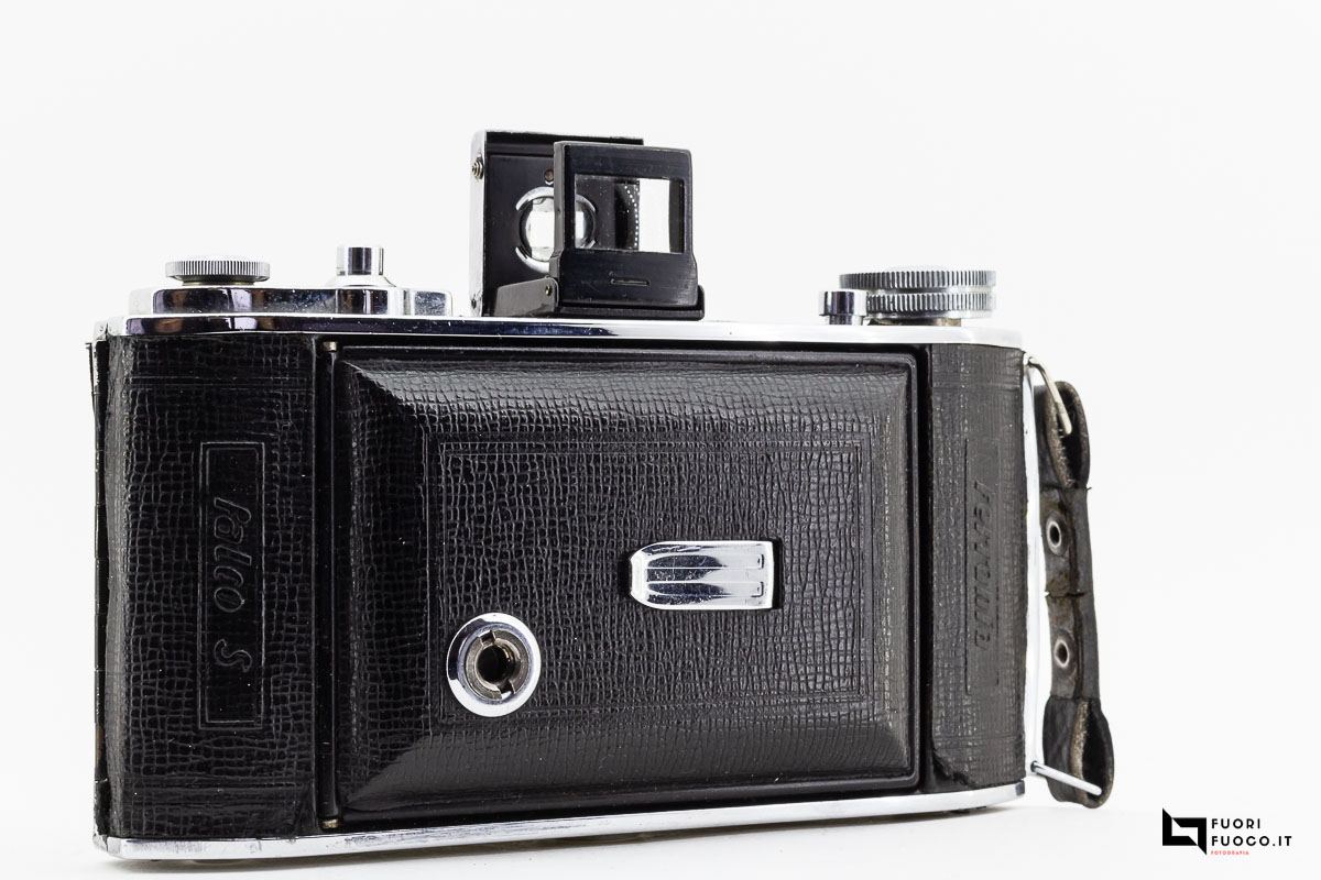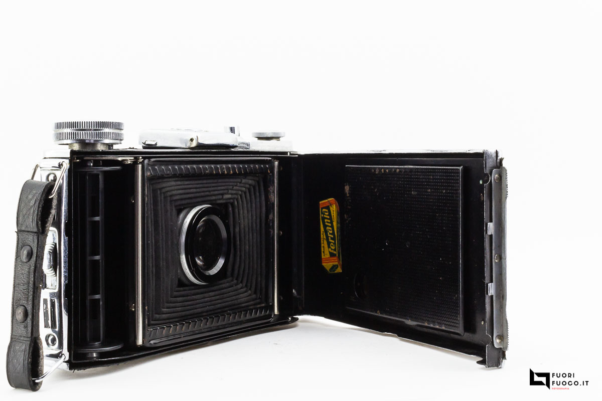 La Ferrania Falco S è un apparecchio “folding” costruito in metallo e rivestito in materiale similpelle.