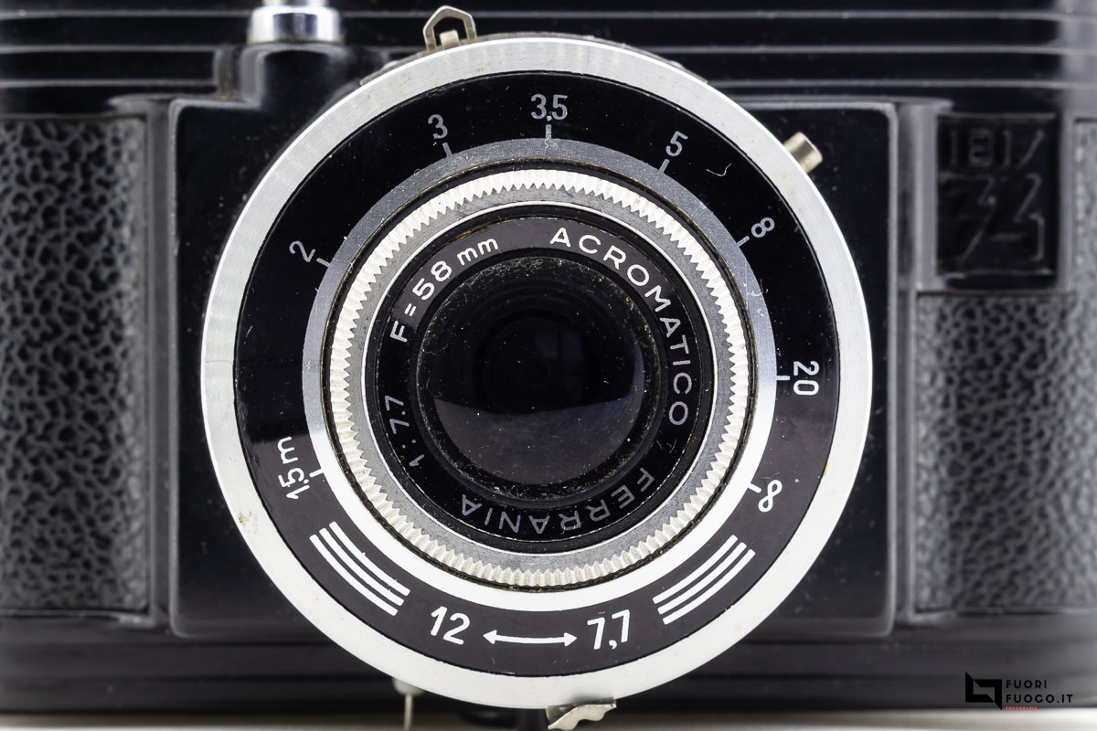Monta un obiettivo acromatico Ferrania con luminosità 7,7 appositamente studiato per la Ibis 34.