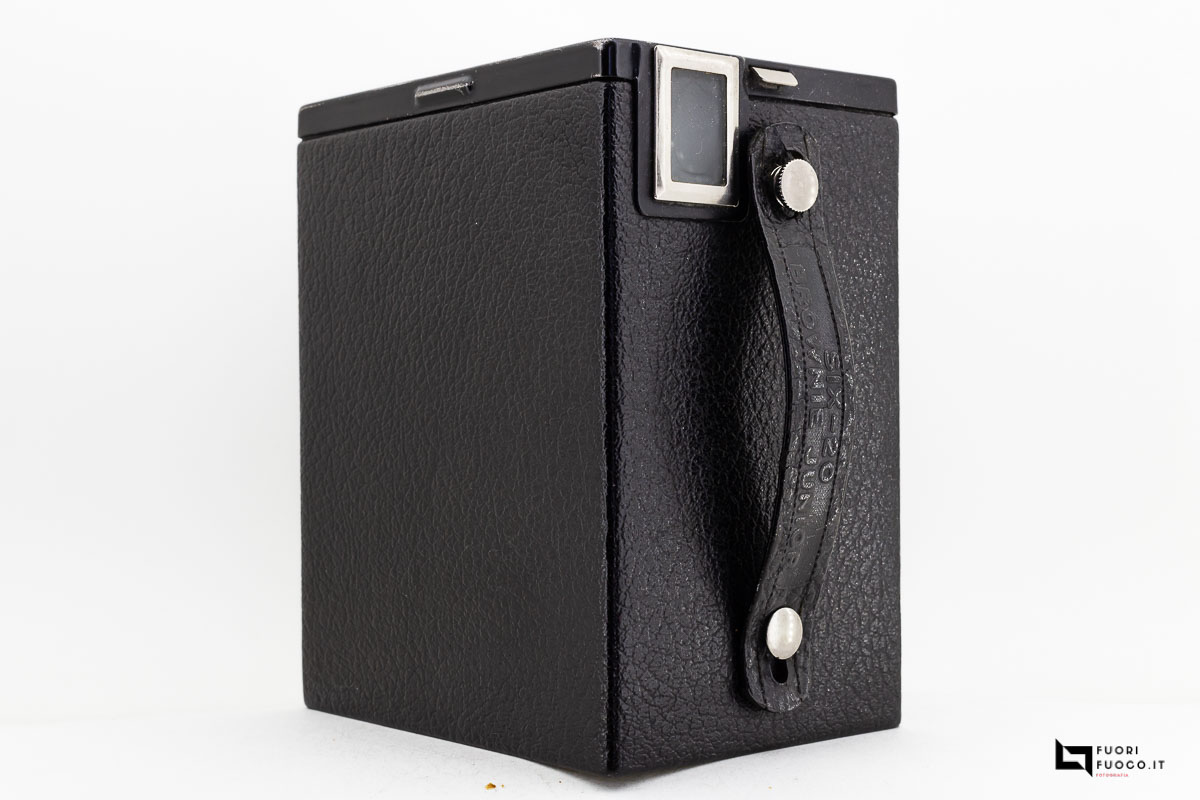 Sulla parte superiore della fotocamera troviamo la maniglia con impresso il nome della fabbrica ed il luogo di produzione, il mirino per lo scatto per ritratto (fotocamera in verticale)