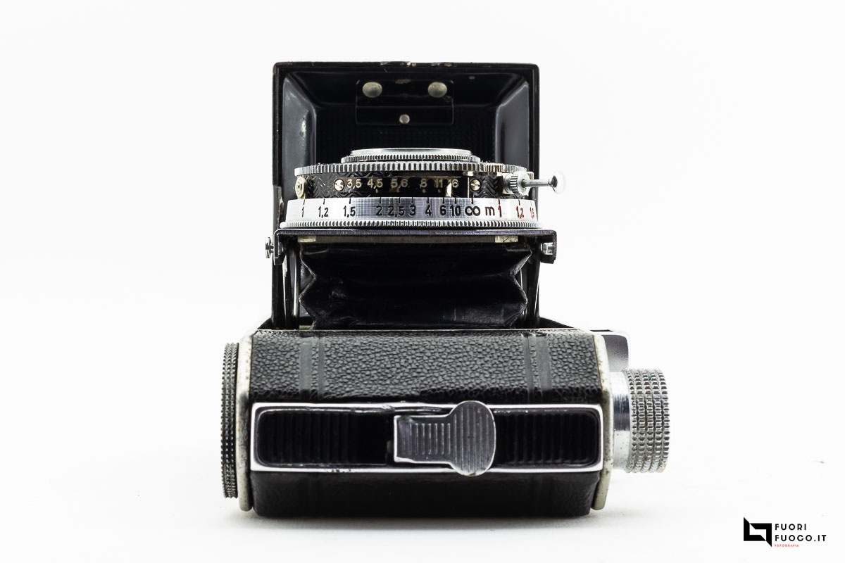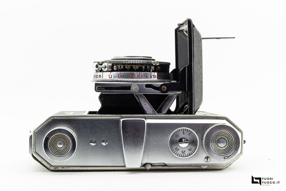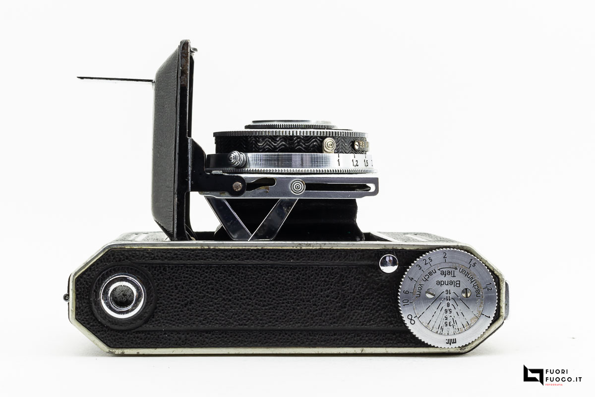 La parte laterale ci offre la vista della leva di apertura della fotocamera, sulla parte superiore sul barilotto dell’obiettivo si notano le scale di apertura del diaframma e della messa a fuoco, nonché il pulsante di scatto rialzato.
