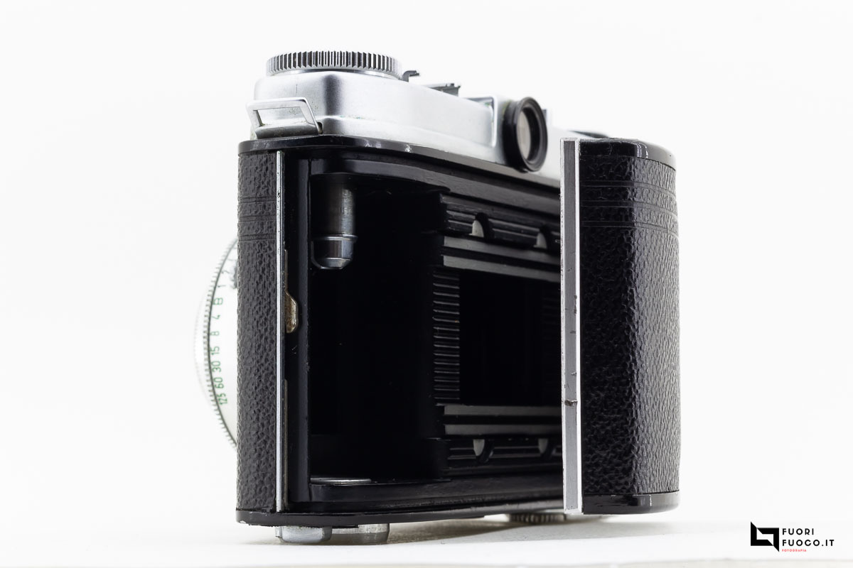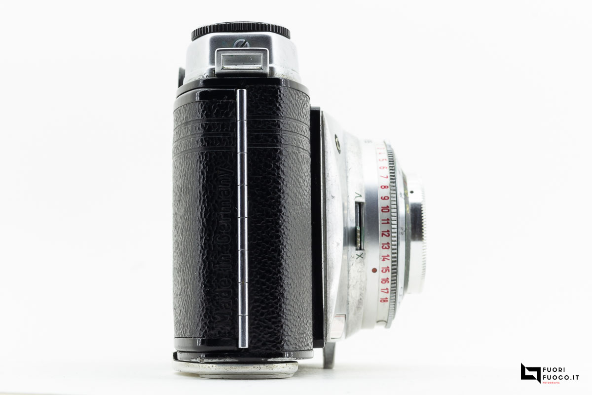 A sinistra sopra il numero di serie, l’alloggiamento per il flash, sincronizzato tramite un cavetto da collegare sul frontale della fotocamera.
