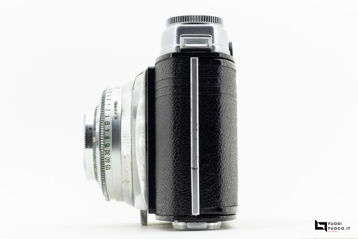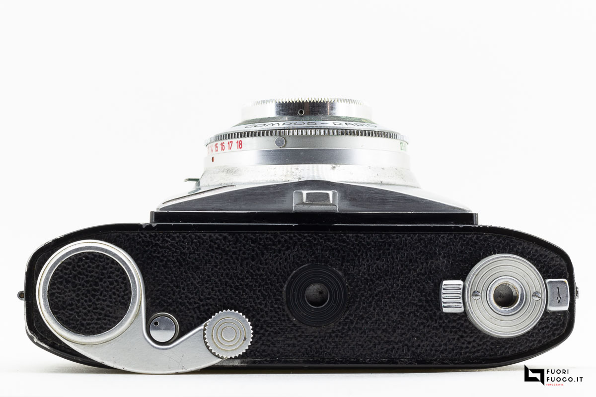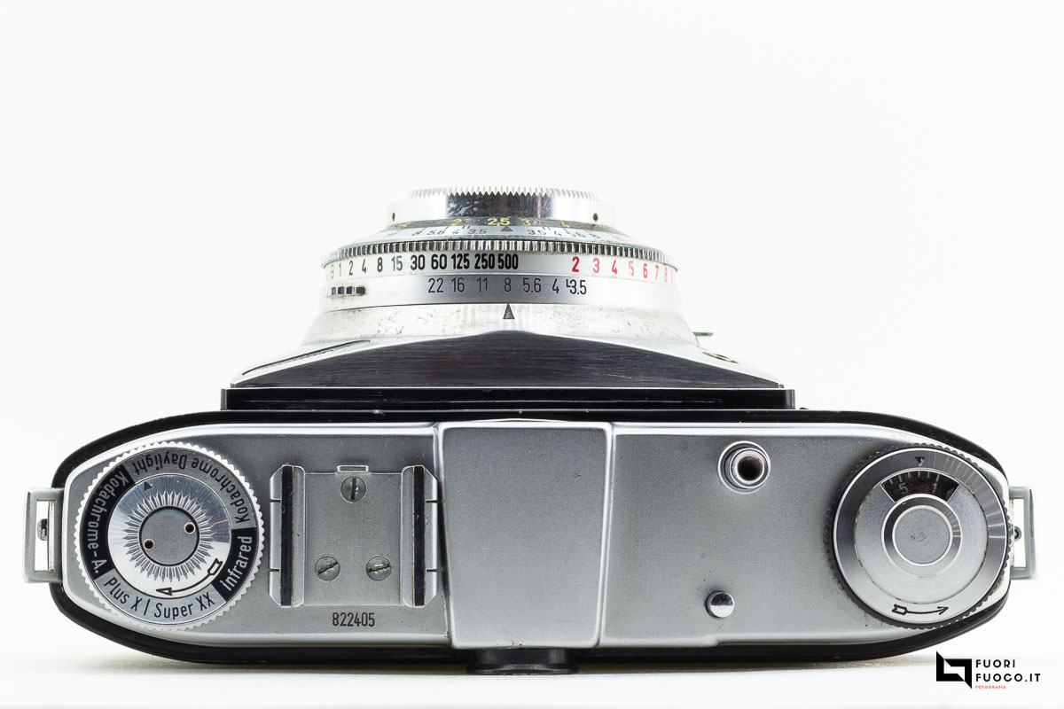 Sulla calotta superiore possiamo notare a destra la ruota di avanzamento della pellicola con il contafotogrammi, al centro il mirino di precisione, sopra a destra il pulsante di scatto e lo sblocco della pellicola per consentire il riavvolgimento.