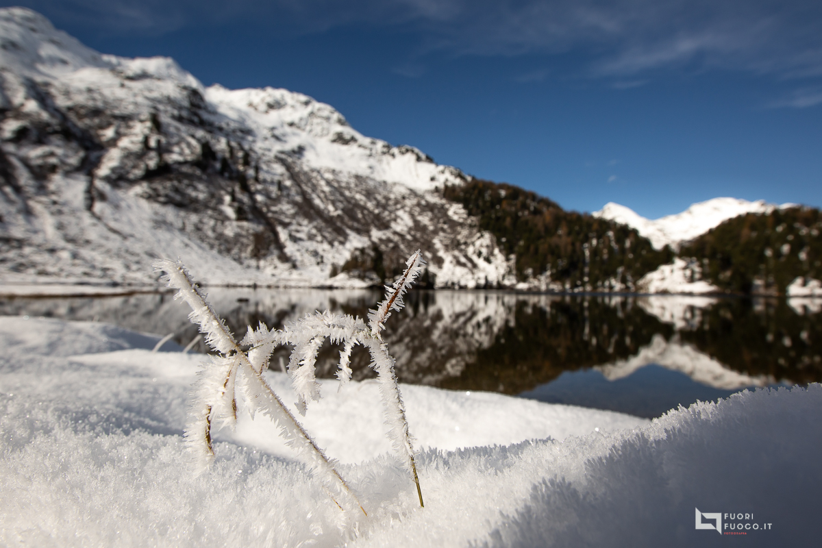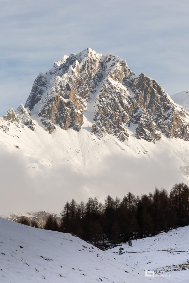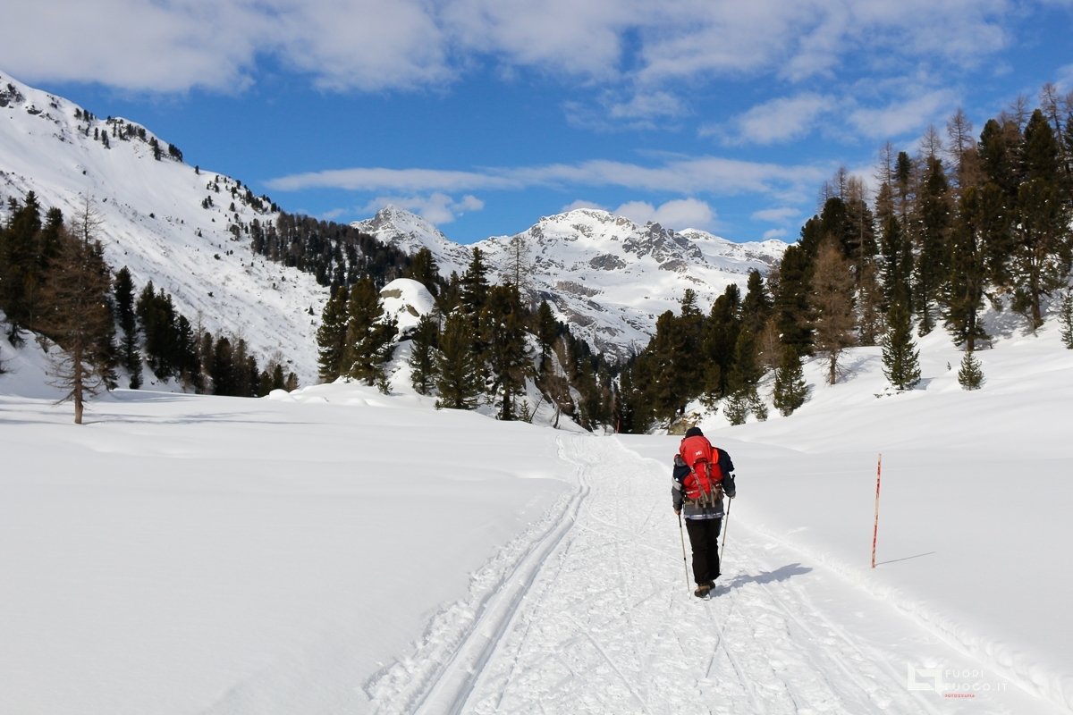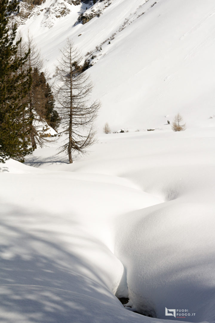 Quando sono gia abbastanza in alto rispetto a Salacina. La strada continuo a camminare tra pini e larici, quest’ultimi con i colori caldi dell’autunno che donano al paesaggio già innevato, una connatazione fiabesca e di totale serenità.