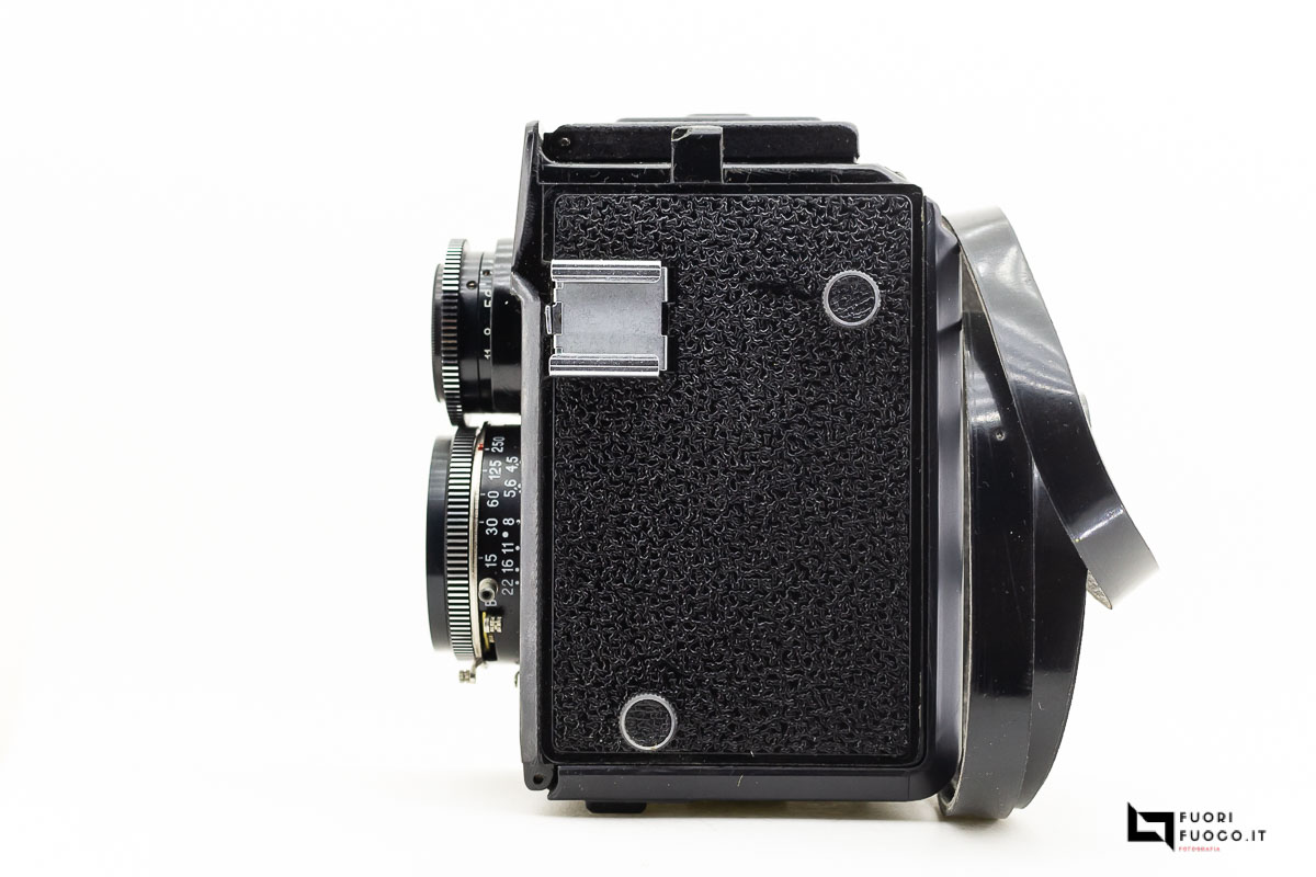 La velocità dell’otturatore va da 1/250 a 1/15 e l’impostazione della posa B; l’otturatore è sincronizzato per il flash, con una presa sul barilotto dell’obiettivo e una slitta fredda sul lato sinistro della fotocamera.