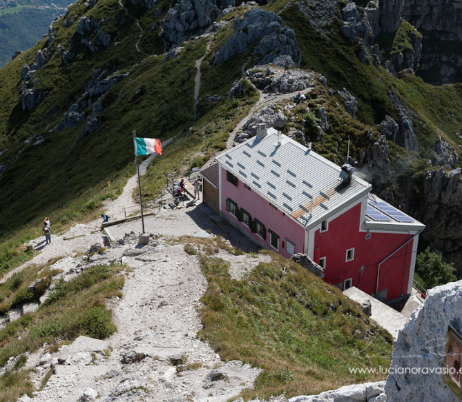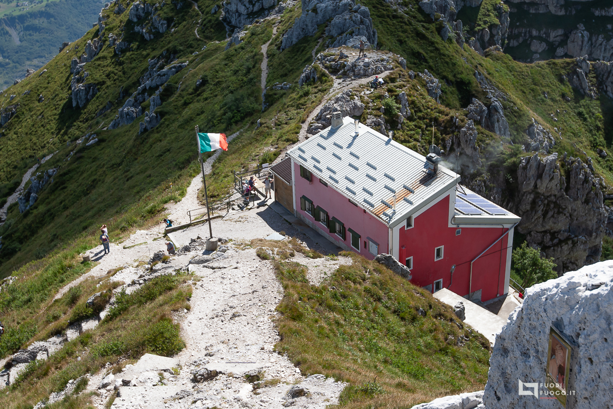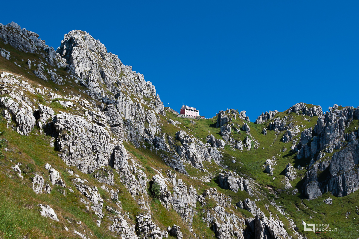 Da questo punto l’occhio spazia sino all’Adda, a Bergamo alta e nei giorni tersi Milano e la Brianza sono ben visibili, attacco le roccette, il rifugio e’a portata di vista, stacca nel cielo perfettamente blu, con i sui colori arancio/viol/rosso