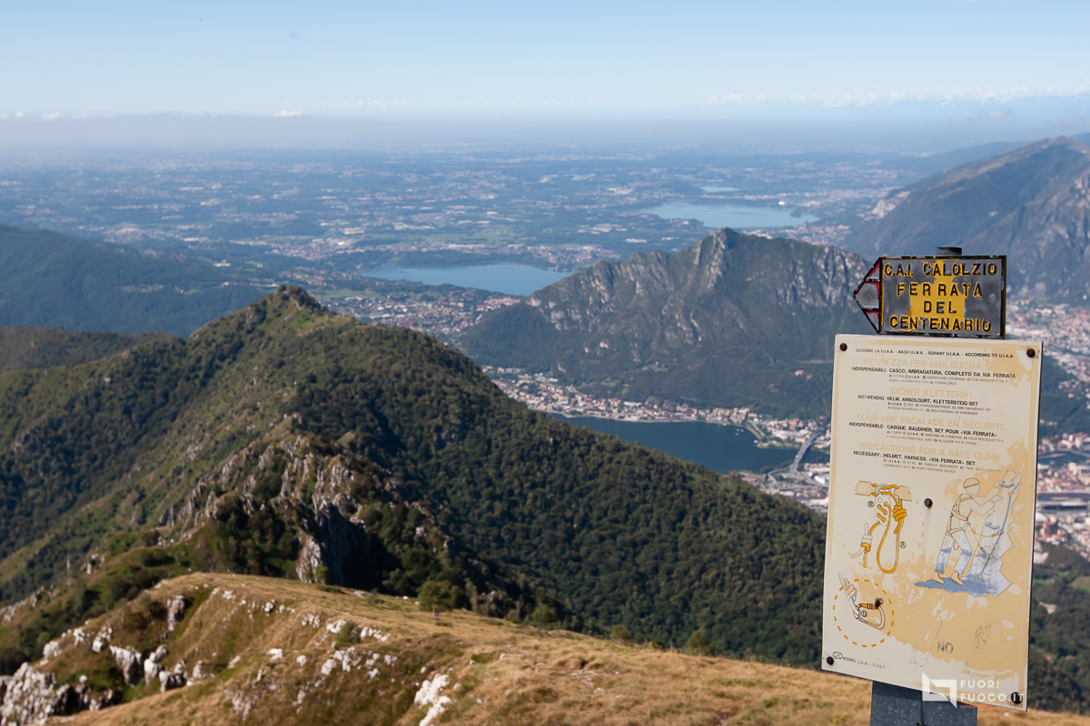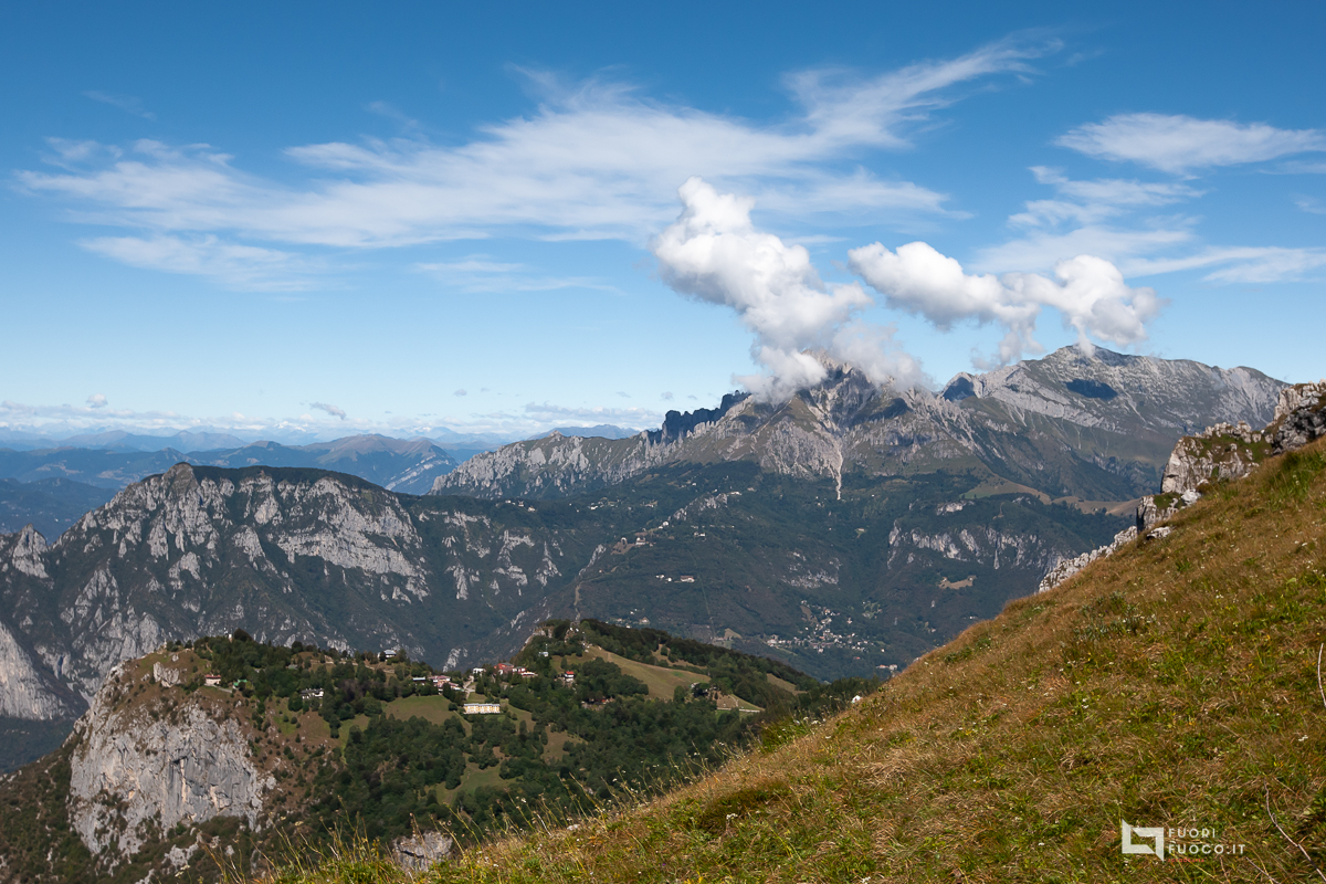 Continuo il cammino che dapprima dolcemente poi con strappi mi porta in quota, un bicchiere d’acqua a Pian Serada, poi il sentiero lascia il posto a roccette , il panorama e’ dei migliori, alla mia destra le indicazioni per la ferrata del Centenario, in basso, molto più in basso l’abitato di Erve, altro punto d’attacco al Monte Resegone, e luogo di passaggio della mitica “Monza Resegone”