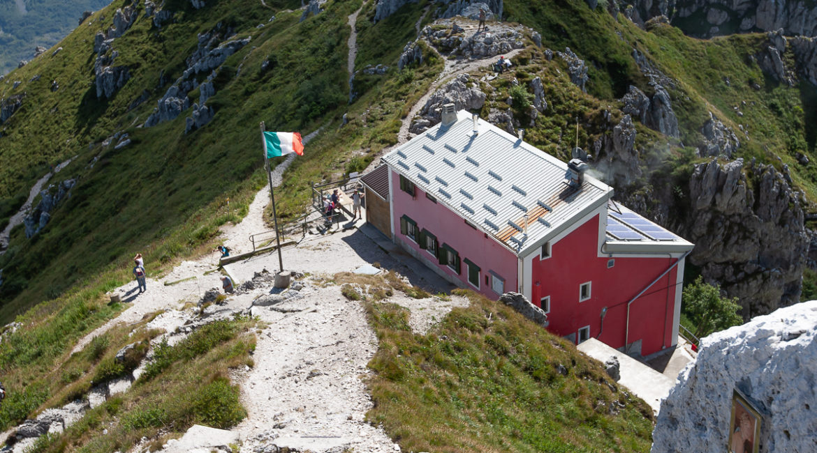 Eccoci in vetta, il rifugio Azzoni e’ frequentatissimo, oggi, solo la comitiva del CAI Bergamo ne occupa gran parte, il clima e’ festoso, una salita alla croce, una preghiera e uno spuntino con davanti un panorama stupefacente, qualche foto e via si riparte.