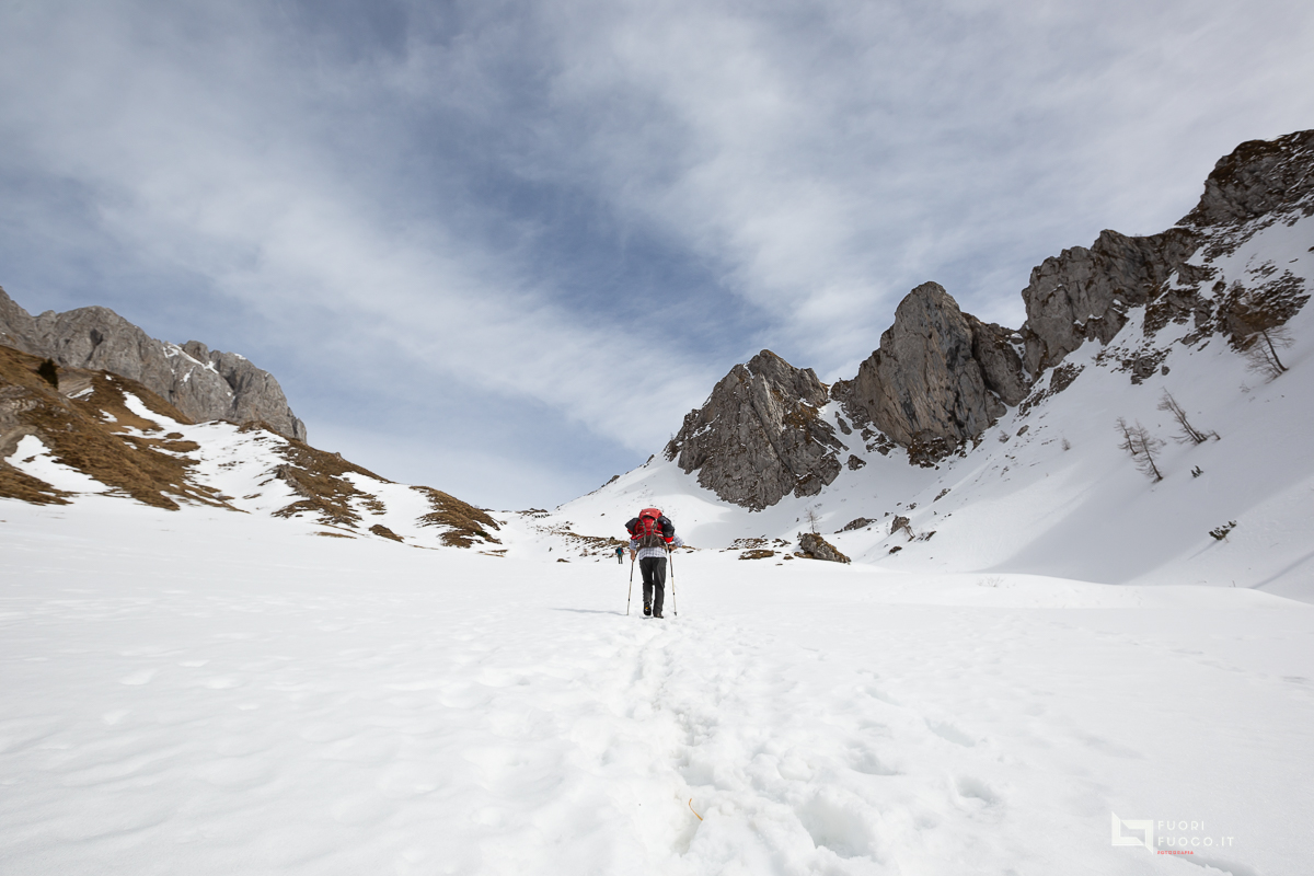 Torniamo sui nostri passi per poi svoltare a destra al passo e discendere un bel vallone innevato, scorgiamo sulla destra il rifugio Olmo.