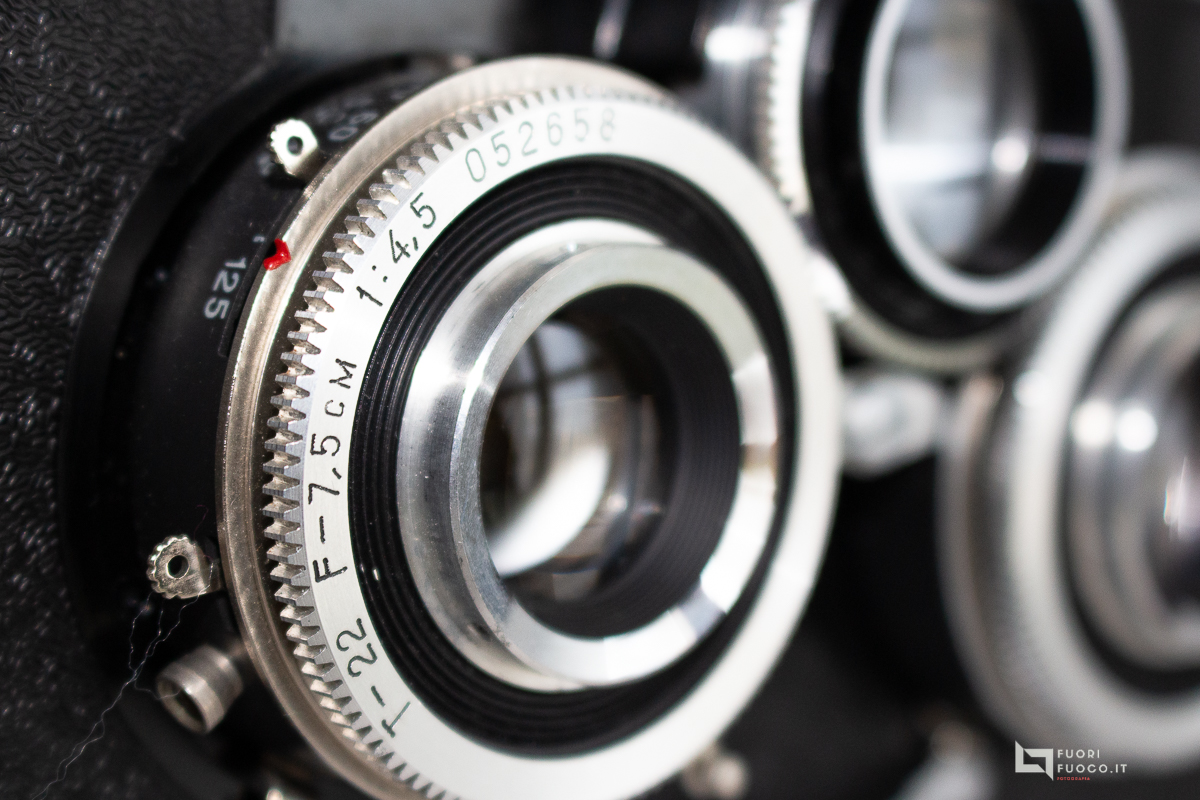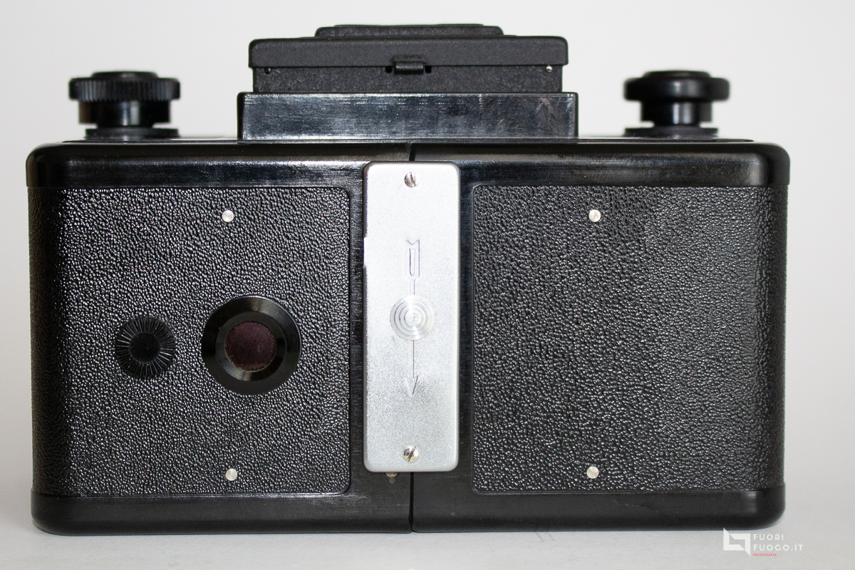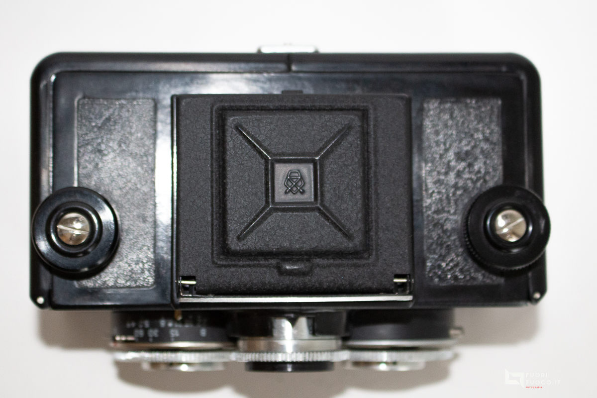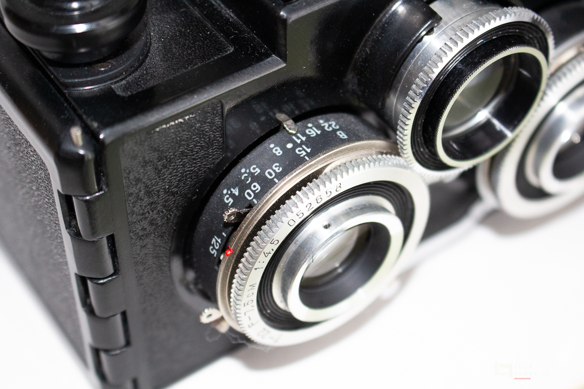 - Shutter mechanical central type shutter with 3 blades, between the lenses. Cocked with separate lever.