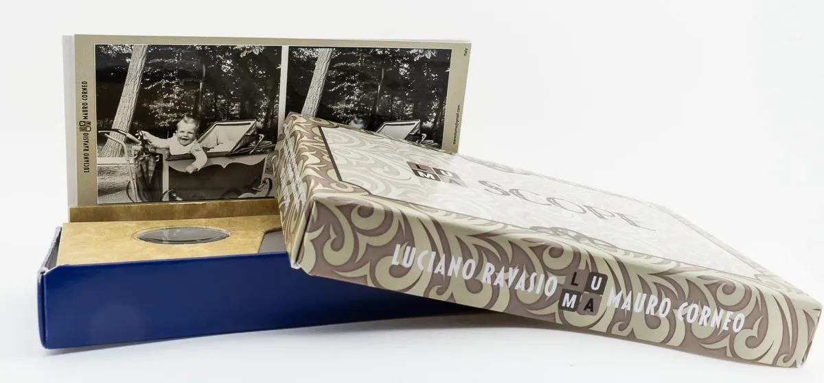 Torchietto per stampa a contatto per immagini in stereoscopia (sopra e a sinistra) visualizzabili con visore LU_MA Scope (a destra).