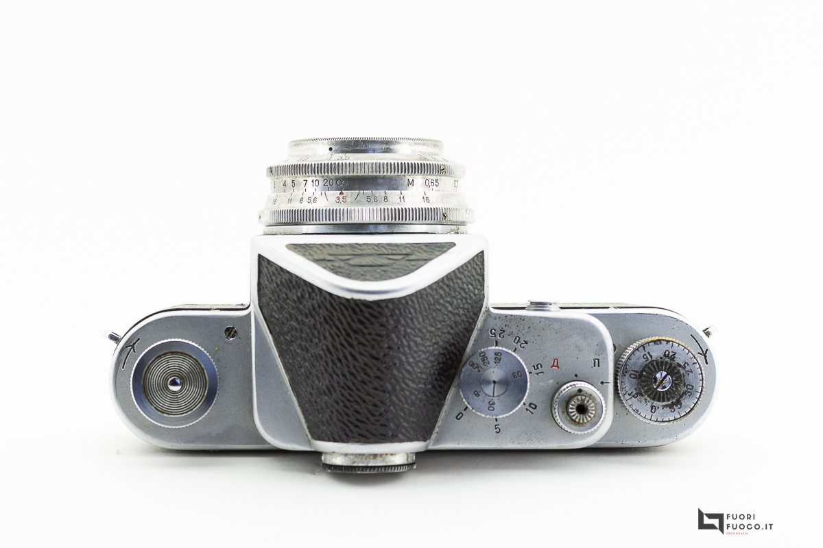 Sul frontale possiamo notare la lente, la slitta in cirillico che indica nome e modello della fotocamera.